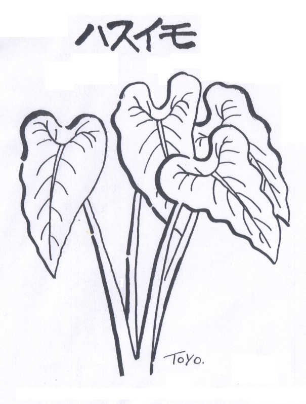 | (16)ハスイモ(夏6月) 葉柄を食用にするハスイモ。さしみのつま、汁の実、三杯酢に、 また乾燥させてズイキにします。 ハスイモは、地上部はサトイモに似ており栽培上はサトイモ類 に含められています。しかし、親イモや子イモは小さい上に堅く、 食用にならないが、植物全体にえぐ味がなく葉柄の皮をむいてみ そをつけ生食できます。 インドネシア原産で、日本でもかなり古くから栽培していたと 考えられています。葉と葉柄は緑白色で、うすく白い粉をかぶっ ているため、白イモとも呼ばれ、ほかに印度イモ、露イモなどの 名もあります。 この葉柄でつくった肥後ズイキを、かつて加藤清正が熊本城を 築く際、いざというときの兵糧のため、城の畳の床に使ったとの いいつたえもあります。 葉柄は1〜2mになり、着るとスポンジのような小さな穴がた くさんあります。生食のほかゆでて和え物に、煮物、汁の実、油 炒めに、乾燥して冬の保存野菜に利用します。 イモは漢方で乾燥したものを煎じて薬用にします。本州の中部 以南に栽培。葉柄は8月から11月ごろまでに収穫できます。サ トイモの近縁種で、強い光をきらい、やや日陰に生育。 ・サトイモ科サトイモ属の多年草 サトイモの近縁種