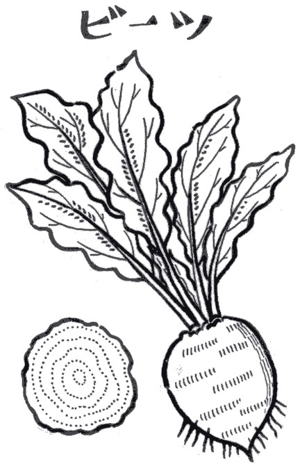 | (18)ビーツ(夏6月) 葉脈、葉柄から根の中心まで真っ赤なため日本名がカエンサイ (火炎菜)という名があるビーツ。ビート類の根菜のひとつ。農 林水産省の統一名称だという。大きくなった根は、扁球形のもの が多いがニンジン形になる品種もあります。 輪切りにすると同じ円の赤い紋があるのでウズマキダイコン(渦 巻き大根)とか、根から砂糖をとるテンサイ(サトウダイコン)、 また、飼料用のものと区別するため、食用ビートとも呼ばれます。 英語ではテーブルビーツ、ガーデンビーツなどの名もあります。 原産地は地中海沿岸とされ、紀元前1000年ころから、ヨーロ ッパで薬用として栽培していたという。いまのような赤いビーツ は、16世紀ごろドイツで栽培されはじめたといわれています。 日本に入ってきたのは、江戸時代だという。江戸中期の『大和本 草』に最初の記事が載っていますが、「真っ赤なデエコン」に江戸 の人がたまげたか、普及した形跡はありません。 下って明治の初め、ふたたび導入しました。1870(明治3)、 東京開墾局で試作。その後、札幌官園で栽培されたという。いま栽 培されているのはその時の品種だといいます。春に種をまいて11 月ごろ、根が直径七から九センチになったところで収穫します。 ビーツは、味そのものより鮮やかなその色を楽しむために使う ことが多い。その色はベタニンという色素だという。天然色素の ビートレッドとして利用されるという。 ビーツは、貯蔵がきくため、1年中店頭に出まわっています。 買う時は、新鮮な肉質のしまった鮮やかな色のものを選びます。 ・アカザ科フダンソウ属の越年草。ビート類の根菜のひとつ