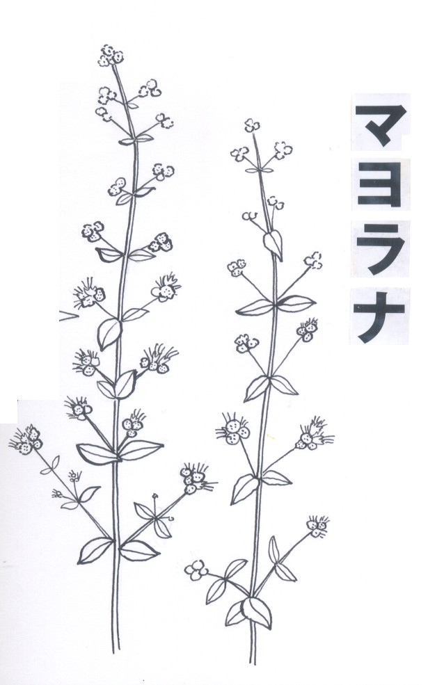 | (20)マヨラナ(夏6月) 葉や茎、花をハーブとして使われるマヨラナ。羊や鶏肉、レバ ーなどの臭み消しに、またスープ、シチュー、ソースなどの香り づけに利用されます。英名でマージョラム、和名でハナハッカ(花 薄荷)だという。 原産は地中海沿岸から、アラビア地域にかけてで、フランス、 ギリシャ、メキシコなどにが主産地だとか。古代ギリシャ時代に も最も好まれたハーブのひとつで、マヨラナとは「山の喜び」と いう意味で、幸福のシンボルになっていたとか。 また酢と塩を混ぜて、サソリの解毒剤に使われた記録があり、 切り傷、歯痛の民間薬にもなっているという。これには眠りを誘 う効果があって、エリザベス一世が他のハーブといっしょに枕に 詰めて寝たと伝えます。