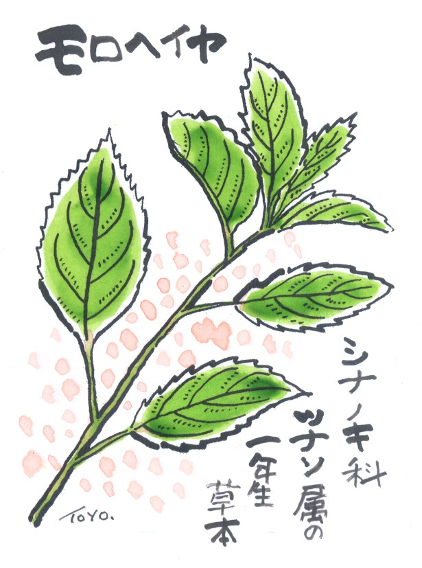 | (21)モロヘイヤ(夏6月) ビタンB1がパセリの3倍以上、ビタミンB2がブロッコリーの 20倍、カリウムもパセリを抜いて第1位。カルシウムが葉トウガ ラシに次いで第2位。鉄分がホウレンソウ、パセリに続いて第3位、 カロチンはニンジンの1.5倍というけたはずれの栄養価を誇るモ ロヘイヤ。健康食野菜ということで、一時話題なったことがある野 菜です。 インド西部からアフリカが原産地で、エジプト、アラビア半島な どの北アフリカや中東では、昔から食べられていたといわれます。 モロヘイヤとは、アラビア語で「王さまだけのもの」という意味だ そうで、あのクレオパトラも常食していたとか。