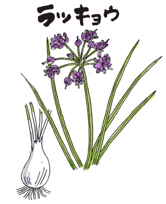 | (22)ラッキョウ(夏6月) ラッキョウは、むいてもむいても皮ばかり。ゆえにツラの皮の 厚い人のことをラッキョウと呼ぶのであります。ナルホド、ナル ホド。 その名は辣韮(らっきゅう)がなまったもので、辛らつな味のす る「ニラ」の意味。 原産は中国からヒマラヤあたり、なかでも中国では古くから栽 培していたそうであります。紀元前400年ころの「山海経」と 言う本や「爾雅」や「名医別録」にも載っているほど。 日本への渡来の時期はイマイチはっきりしないが平安時代の本 「新撰字鏡」(900年)にナノミラ、「倭名類聚抄」(923〜9 30年)には於保実良(オホミラ)などと出ているところから、日本 へ入って来たのは9世紀ごろでは……とされています。 江戸時代になると、「農業全書」(1606年)や「大和本草」(1 709年)にラッキョウの栽培法が書かれていますが、「本朝食鑑」 (1695年)に「あまり賞味せず」とあり、においが嫌われてい たようです。 また延喜式(えんぎしき・928年)にはラッキョウを薬用に 供したとあるように、発汗、消炎、制菌などの効用があるそうで す。 【効能】風邪・痰切り・腹痛・食欲不振・呼吸困難・鎮痛など。 ・ユリ科ネギ属の多年生草本