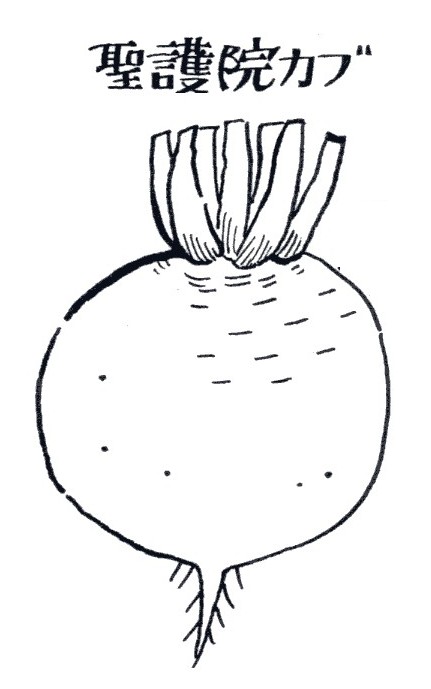 | ▼(10)聖護院カブ(冬1月) 直径15〜18センチの扁円で日本で最大の白カブ。この千枚 漬けは、北海道赤カブ千枚漬けと共に全国一だという。享保年間 (18716〜36)京都・愛宕郡聖護院(いまの左京区聖護院) の農業、伊勢屋利八という人が近江国堅田から近江カブの種子を とりよせ栽培。 京都の風土に合い巨大なカブが出来、聖護院カブと名づけまし た。色は白色かまたはすこし黄色みをおび、肉質がむっちりとキ メ細かく、甘味が多いので煮食にもよい。天保年間に千枚漬けが ができて、聖護院カブは一層有名になりました。 利八は、野菜作りに熱心で、天保元年(1830)早生野菜の 先進地である和歌山へ調査に行き、川原の石を集めて太陽熱で暖 め、わら囲いをしてさくもつの根本の温度をあげ収穫を早め、6 月頃に野菜を出荷したりしたそうです。 ・アブラナ科アブラナ属のカブの一種