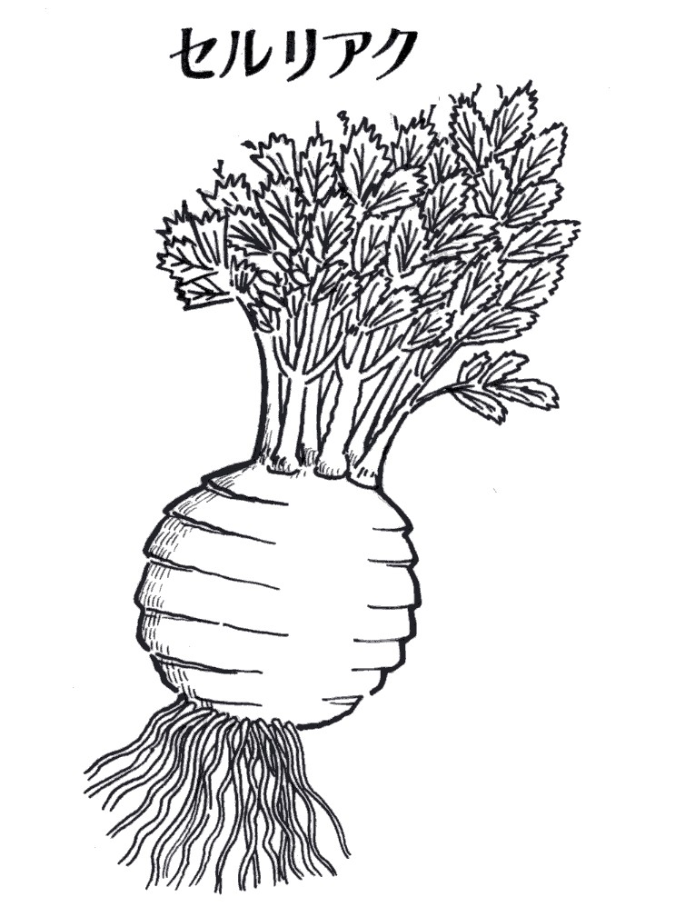 | ▼(11)セルリアク(冬1月) セロリと同野生種から発達したセロリの変種。根セロリともい ってカブのような根を食べます。南ヨーロッパ原産で17世紀イ タリアが最初だという。 葉や葉柄はセロリに似ていますがあまり大きくならず、苦くて 堅い。そのかわり直径10センチくらいに肥大した球状の根を利 用。セロリと同じ香りがします。 日本には明治初年に伝来。明治6年(1873)の「西洋蔬菜 栽培法」(開拓使蔵版)に「セルレアカ、白芹(セロリ)、3月2 0日頃苗地に白芹の如く播種し……」と記載されています。 若い根を生のままサラダのし、大きくなったものはスープやシ チュー、バターいため、フランス料理に利用されます。 ・セリ科セロリ属のセロリの変種