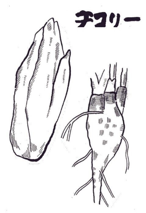 | ▼(12)チコリー(冬1月) スーパーなどの店頭にハクサイの芯のような形のチコリーがな らんでいます。これは春種をまき、株を養成、秋に掘って植えこ み、おがくずなどをあつくかけ、春の芽生えを軟白したもの。 チコリーは、生でサラダにしたり、1枚ずつはがした葉にいろ いろなものをのせ、オードブルに、またグラタン、バターいため、 蒸し煮などに利用します。またこの根を刻んで乾燥、炒って粉末 にしたものはコーヒーに混ぜると味がまろやかになるという。そ の他根を煮食したりします。 チコリーは、ヨーロッパ、北アフリカ、中央アジアの原産。フ ランスでは早くから栽培して食べていたといい、日本には江戸末 期に伝来し、チコレと呼んでいましたが、普及はしませんでした。 葉に強い苦みがあり、キクニガナの異名があります。 春、太い根から先のとがった根出葉を出し、茎をのばし、夏に とう立ちし1〜2mの高さになり、花を咲かせます。花は品種に より、青紫、淡紅、白色などいろいろ。花は径3センチくらいで タンポポに似た形。 茎や葉、根を傷つけると白い乳液が出ます。乳白色でよく葉が 抱合したものがよい。 キク科キクジシャ属の1年草。