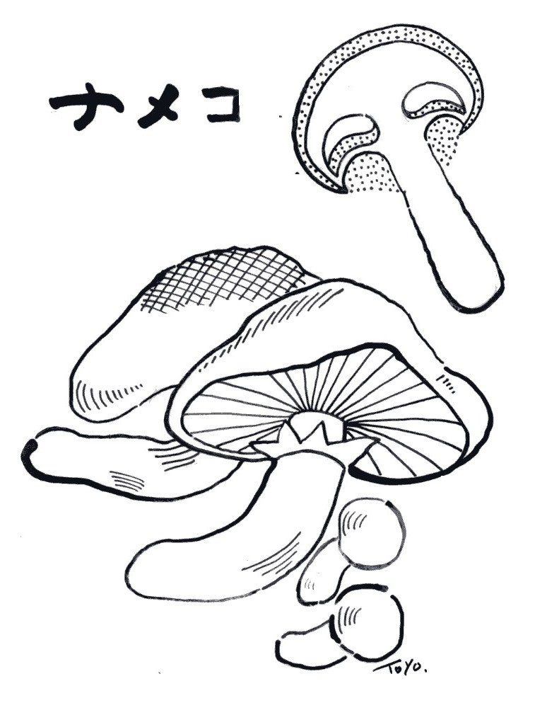 | ▼(14)ナメコ(冬1月) 秋から冬、広葉樹の、特にブナの枯れ木や切り株に生えるナメ コ。いまでは人工栽培で行われています。日本の原産。表面にぬ めりがあるため、ナメコの名がつけられています。地方名もナメ スギタケ、ナメススキ、ヌラボコなどと呼ばれているそうです。 ナメコ栽培は、ブナやトチの原木に種菌を植える方法と、おが くず培養基に種菌を植えるおがくず栽培があり、広口のびんで培 養するびん栽培も行われています。 とくに近年広まったのが箱栽培。魚運搬用の木箱を用いて、お がくずと米ぬかの混ぜたものを蒸気で殺菌。ポリエチレン布など を敷いた箱に移し、種菌を接種。アオカビなどの害菌が入らない よう気を使うという。こうして3、4ヶ月で菌糸が発育、やがて キノコが発生します。 昭和初期、東北地方が凶作になったとき、その対策として農家 の副業としてナメコ栽培が始まったという。戦前は、山形、福島 のものが高級品とされていましたが、いまでは全国的に普及して います。 ナメコは傘が3から8センチ。表面は黄褐色で、中央は茶褐色。 茎の長さ2から8センチぐらいでつばがあります。買うときは傘 があまり開ききらないもの、ぬめりが多く肉の厚いものがよい。 ・モエギダケ科スギタケ属のキノコ