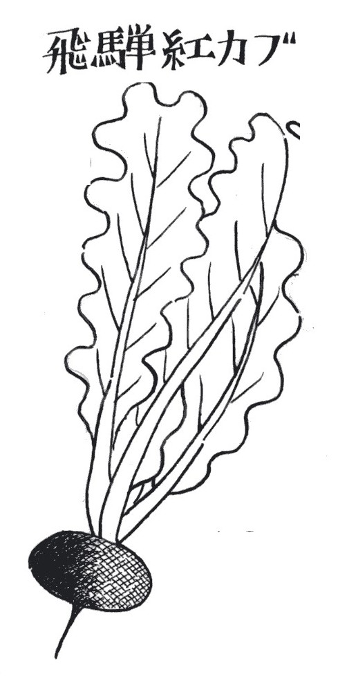 | ▼(16)飛騨紅カブ(冬1月) アカカブは各地に名産がありますが、飛騨紅カブもそのひとつ。 これは、飛騨地方・岐阜県高山市付近で栽培されているもので、 長い間雪の中に閉ざされる飛騨地方では、大昔から保存食として いろいろな漬け物に利用して、大事にされてきたといいます。 丸のまま塩漬けにした「カブの丸漬け」、ナスやキュウリ、キノ コなどとともに塩で漬け込んだ「品漬け」などは有名で、どれも 紅色をしています。飛騨紅カブは、食部分の根がやや扁平な形で、 皮が緋紅色をしていてきれいです。 葉の柄は紅色が全くなく、緑色をしているのが他のアカカブと 異なるところ。かつては、高山市を流れる宮川はこの野菜を洗う 人たちでにぎわい、「宮川の菜洗い」は冬を告げる風物詩だったと いいます。 アブラナ科アブラナ属の越年草