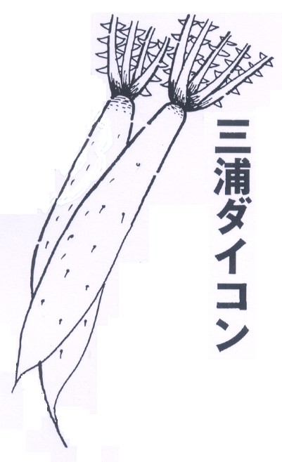 | ▼(17)三浦ダイコン(冬1月) 首が細く、中央部が太い極晩生の三浦ダイコン。1月中旬から 3月の中旬ごろまで出回ります。三浦ダイコンは、その名のよう に神奈川県三浦半島の原産。 かつては横浜市付近に、中膨(なかぶくら)ダイコンと呼ばれ る、根が短く、胴の太い晩生のダイコンがありました。これと練 馬ダイコンが自然交雑。 そのなかから選抜育成してできたのが三浦ダイコン。その時協 力したのが東京練馬区春日町の鹿島安太郎。練馬ダイコンの栽培 改善、品種改良につくし、ダイコン博士と呼ばれていたという。 温暖な三浦半島では、冬でもよく成長、肥大しつづけ、春にな っても「す」が入らず、肉質がやわらかく甘味に富んでいます。 このダイコンは、長さ60〜70センチになり、首は細いが下に いくほどだんだん太くなり、4分の3くらいのところでは、直径 15〜189センチにもなり、先端は急に細くなってとがります。 一本の重さが2.6〜3キロ。 戦中、戦後にかけて、不完全な自家採取で品質が悪化したこと があったが、神奈川県農業試験場で優良系統をあつめて選抜、昭 和27年に「早生三浦」を作出。普及栽培されるようになったと いう。 ・アブラナ科ダイコン属の根菜