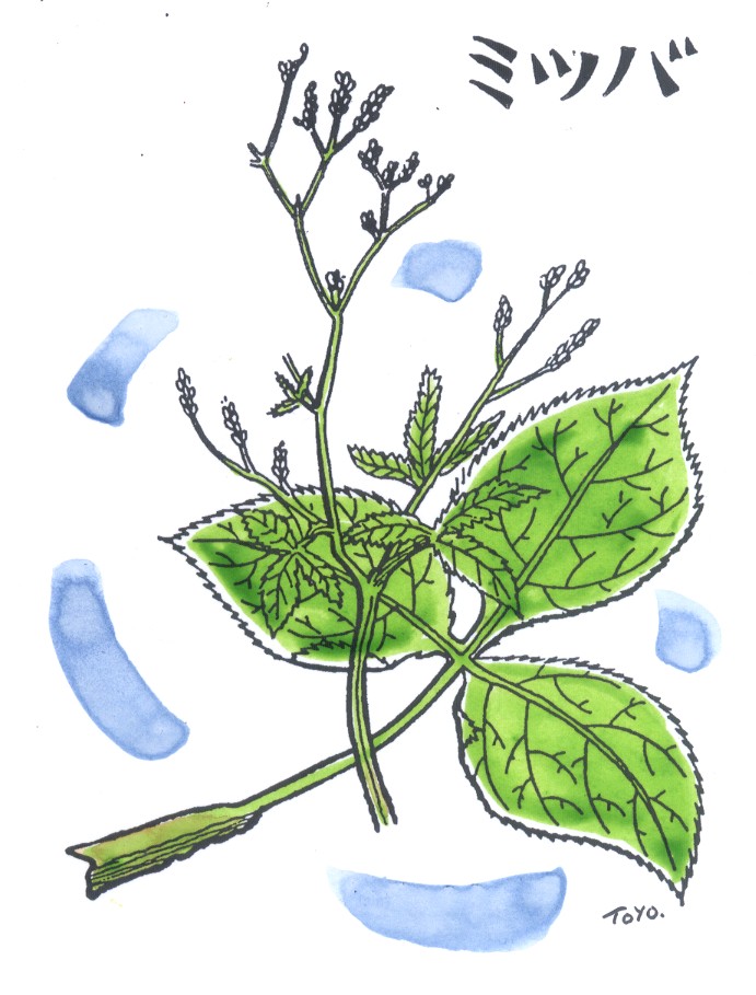 | ▼(18)ミツバ(冬1月) ミツバは三ツ葉であり、読んでの通り、三つの小葉があるとこ ろからついた名前です。ミツバゼリともいって、日本に大昔から あるセリ科の多年草であります。 ミツバはもともと山野の日陰に自生していたもの。つまり野草 でありました。プーンとくるあの独特の香りが好まれ「庭の隅に でも植えてみよう」ということになり、だんだん野菜に昇格、つ いにはハウスで栽培されるようにまでなっていきます。 ついでながらあのプーンのもとはクリプトテーネンとミツバエ ンという成分だそうであります。だからどうしたといわれると困 りますが、この香りが原因かミツバを料理に使う習慣はアメリカ やヨーロッパにはないとか。栽培してまで利用するのは日本と中 国だけなのであります。 ミツバをたべはじめたのは正徳年間(1711〜16)。貝原益軒が「菜 譜」という本に書いています。それによると「本草に載せず。救 荒本草(明代の本)に見えたり。毒なし。性は大抵セリと同じか るべし……その茎の味よし。昔は食わず、近年食しはじめ、市に ても売る」と……。 享保年間(1716〜36)になり、東京・葛飾の水元町で軟白栽培 をはじめ、おとなり千葉県松戸で改良、関東一円に広がったもの。 明治も30年代になり、関西へ伝播されたのでありました。 セリ科ミツバ属の多年草