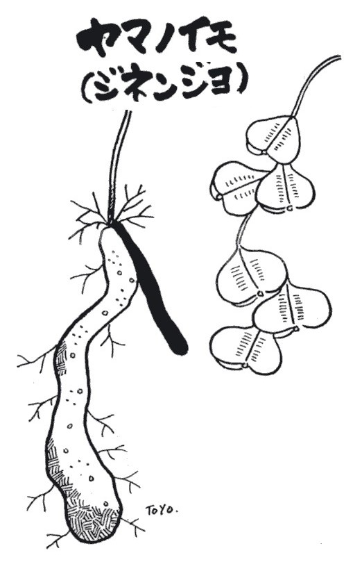 | ▼(19)ヤマノイモ(トトロイモ)(冬1月) ヤマノイモには野生のジネンジョ、畑で栽培する野菜としての ナガイモ、三重県特産のむかごができないダイジョ、小型で甘味 のあるトゲイモ(日本では南西諸島で栽培)、クリのような味の するカシュウイモなどの種類があります。 ナガイモは中国南西部の雲南地方原産。日本には中世に朝鮮半 島を経由して入ってきたという。イモの形により大きくナガイモ (長形種)群とイチョウイモ(偏平種)群、ツクネイモ(塊形種) 群の3つに分けられます。 ・ナガイモ群のナガイモや育成が早い一年イモは細長く、北海道、 長野、東北地方などで多く栽培。また、やや太く短いトクリイモ、 キネイモなどは関東から関西で作られます。粘りけが少なく、含 め煮、せん切りに利用。 ・イチョウイモ群は、関東ではヤマトイモとも呼び、粘り気が強 くトロロ汁によい。イチョウの形をしたイチョウイモ、手のひら の形をした仏掌イモなどの品種があります。 ・ツクネイモ群(関西ではこれを同じくヤマトイモという)は、 げんこつのようなかたまり。丹波ヤマノイモ、伊勢イモ、大和イ モなどの品種があります。粘り気が強く良品質。関西から石川、 愛媛などで栽培。トロロ汁や菓子の材料にされています。 【効能】強精・強壮食品。糖尿病・頻尿・寝汗精力減退に。 ・ヤマノイモ科ヤマノイモ属のつる性植物