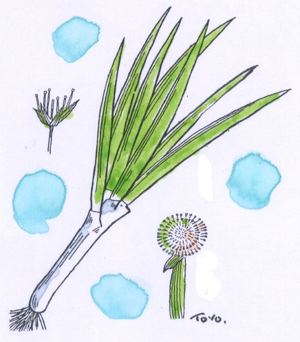 | ▼(15)ネギ(冬1月) ネギも古くからつくられている作物です。「日本書紀」(720 年)や「万葉集」に出ており中国では「爾雅(じが)」という古い 本に「葱は本白くして末青し、青色は最も美なり。而して青は之 を葱ともいう」とあるそうです。 古いといってもこの本ただの古さではなく、周から漢の時代にか けて大勢の儒家が採録したというシロモノ。日本でも「日本書紀」、 「万葉集」のほか「本草和名」(918)や「延喜式」(927)、「倭 名類聚抄」(934)など続々と登場します。 また、聖武天皇の天平9年(737)に天然痘が大流行、そのと きの予防の法令の中に、ネギをたくさん食べないようにという個 条があったとか。天然痘とネギの関係ウンヌンは別にして、かな りイニシエから食べられていたことはたしか。 ネギはなぜネギというのか。それは……むかしネギはキ(葱)と呼 ばれていました。ではなぜ「キ」か?「きとはきたないの「き」な り。そのにおいくさくきたなし」(「日本釈名」)。「葱(き)は気の 義なり。根葱、分葱、刈葱などと称せり」(「倭訓栞」)。「本名葱 一音なれば、一文字の異名もあり、根を賞するにより根葱(ねぎ) という」(「言海」)などと古書にあり。 ネギは臭気があるので気といい、気は岐、葱に通じ(どうしてェ?)、 根を賞味するので「ネギ」なのであります。(アーくるしかった)。