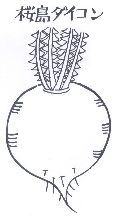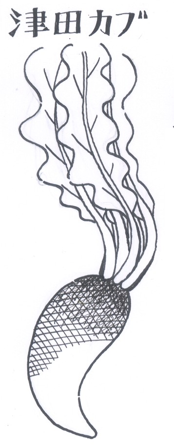| ▼(11)津田カブ(冬2月) 津田カブは、根が牛の角のように曲がっていて、独特の形をし ています。地上部に出ているところが紫っぽい紅色で、下の地中 にあるところは白く、肉質も全体が白い。 津田カブは、島根県松江市周辺で栽培され、江戸時代初期、松 江藩・松平直政の時代から栽培されていたらしいという。いまも 島根県松江市付近で栽培されています。 このカブのもとの品種は、江戸時代の初めに松江の藩主松平直 政が、近江から持ち帰ってきたものと伝えられています。松江市 付近には大正時代に、松江カブと呼ばれるカブがあったという。 小さくて妨鐘形の原始型に近い硬いカブで、地上部は紫紅色をし ており、漬物に用いられました。これが津田カブの原種かも知れ ないという. 現在のカブは八東郡津田村(いまの松江市東津田町)の篤農家 立原紋兵衛(文政九年生まれ)という人が、在来カブから改良し たもの。大正の初めころから津田カブと呼ばれるようになったと いう.このため、「紋兵衛カブ」とか八雲カブ、大目カブとも呼ば れています。 成長が速く、肉質がち密でやわらかく甘味が強く漬け物に適し ています。アカカブの色はアントシアン系のシアニンというもの だそうです。この色素は酸性により赤味を増し、色がいっそう映 えのるで、酢につけたり塩に漬け乳酸発酵させて利用します。 稲の稲架を利用して天日乾燥する。晩秋から初冬に収穫します。 葉は立性で毛はありません。ある程度洋種系品種の遺伝質も入っ ているものらしいという。 アブラナ科アブラナ属の越年草