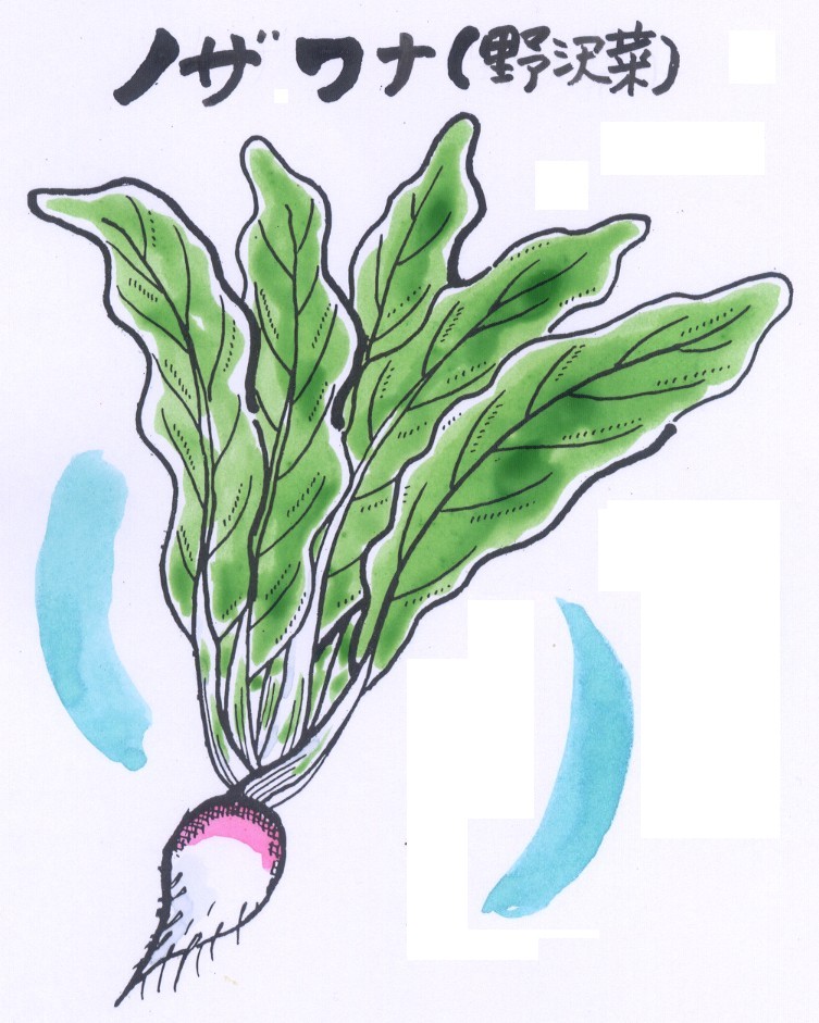 | ▼(12)ノザワナ(冬2月) 「橋と船、お城、しろうと茶屋、揚げ屋、天王寺かぶ 石屋、植 木屋」…江戸時代の大阪名物だという。 宝暦年間(1756〜64)、信州高井郡往郷村野沢温泉の建命寺の住 職・晃天園瑞(こうてんえんずい)が、京都、浪華に遊学しました。 その時みやげに買ったのが、大阪名物のひとつ天王寺かぶの種。持 ち帰り、寺の畑に播きました。 ところが北信濃のきびしい寒さのためか、葉だけのびて、根やか ぶはさっぱり大きくならない。三尺もの葉っぱになってしまった。 それを見た村人に「三尺菜」と陰□をたたかれるしまつ。住職は葉 を利用し漬け菜を試みます。塩不足のため、越後の海岸から海水を 樽で選んで漬けてみました。 海水のため、海苔の気も含んでいるせいか、食べてみると…… 「ン!うまい、うまい」。多くの人に喜ばれます。以後、「野沢菜」 の名をもらい、大変な人気。付近一帯に分け与え、栽培させたとい う。 これ以来、建命寺は寺種子として農家に配給、販売を続けており、 200年後のいま、北信濃だけてなく、信州安曇郡に「稲核菜(いね こきな)」、伊那郡箕輪を中心に「葉広菜」、甲州では「鳴沢菜」と して、また新潟県の「大崎菜」をはじめ、北海道地方にも広まり、 耐寒性が強いため積雪地方の清け菜として重宝がられています。 ノザワナはアブラナ科アブラナ属の一年草。カブの一系統で、葉 の長さ50から80センチ、濃い緑色をしています。春にとう立ちして、 黄色の十字花をつけます。根かぶは淡紫色で、あまり発達しません。 干しダイコンと同じように利用します。漬け物で食べるときは、塩 分のとりすぎに注意。