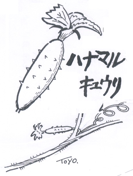 | ▼(13)ハナマルキュウリ(冬2月) さしみのつまなどに用いるハナマルキュウリ。長さ2〜3セン チのこどもの小指くらいのキュウリに花がついています。花付き キュウリ、花キュウリなどともいい、花の新鮮な黄色が失せぬよ う開花当日の日の出前に収穫、荷作りして出荷にも注意をはらい ます。 キュウリには節成り(春キュウリが多い)と房成りがあります が、夏キュウリは飛節が普通。ところが、この中に夏節成りがあ り、これと春キュウリの「落合」という品種を交配。 できた「長日落合」は、春キュウリのころにも、また夏秋の時 期にもよく節成りになって「ハナマルキュウリ」として穫るのに 適した品種だという。実の部分を塩でこするか、熱湯につけて色 出しします。 ウリ科キュウリ属の1年生つる草