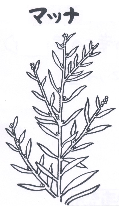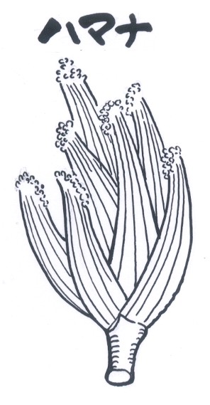 | ▼(17)マツナ(冬2月) 松の葉のような野菜・マツナ(松菜)。芽の出はじめのような若 菜や芽を摘んで利用します。ゆでてからひたし物、あえ物に。姿 の面白さを用いる小物野菜の一種です。 マツナは、中国、朝鮮半島、日本(本州中南部、四国)の暖地 の海浜に自生しています。また延宝年問(1673〜1681) に明の僧侶が日本へ伝えたともいわれています。マツナはアカザ 科の1年草で、十分育てば高さ1mにもなり、枝を多く出して1 〜3センチの線形の葉を密生します。 3月から9月に種を蒔いて、本葉が7〜8枚出たときから、高 さ20センチくらいまでの間に収穫。また、冬から早春の間に収 穫するには11月から3月にかけて、温床内に蒔き、発芽後1ヶ 月くらいで収穫されます。 ・アカザ科マツナ属の1年草