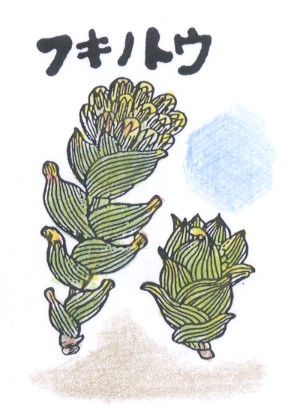 | ▼(15)フキノトウ(冬2月) 春の野草としてもおなじみのフキノトウは、汁の実、みそ和え、 てんぷらなどに食用にされます。これには苦味質や精油が含まれ、 苦味質は、食欲を増進させる効果があり、精油には痰切り、せき 止めなどにも効果があるといいます。葉は、苦味配糖体や粘液、 サポニン、タンニンなどを含み、同じような効果があるという。 フキノトウは、日本原産の多年草である、キク科フキ属のフキ の花茎。野草としては、寒冷地の雪を破って出るものほど、香り がよいとして珍重されます。 山の斜面一面に咲いたフキの花から吹き散る白い冠毛のついた 種子は、まるで山吹雪のよう。そのヤマフブキがなまってフキの 名があるという。さらに、形が塔に似ているのでフキノトウの名 がつきました。地方によってはフキノジイ(蕗の祖父)ともフキ ノシトメ(蕗の姑)と呼んだりするそうです。 【効能】食欲増進。葉や茎の生汁は虫さされ・切り傷・軽い火傷 によし。消化を助け、痰を切り、咳止め・ぜんそくや食欲増進に よい。フキノトウやフキの葉を陰干しして乾燥、1日10から2 0グラムをコップ3杯の水で半分になるまで煮詰め、3回に分け て食膳に服用するとなおよいという。 キク科フキ属の多年草フキの花茎(雌雄異株)