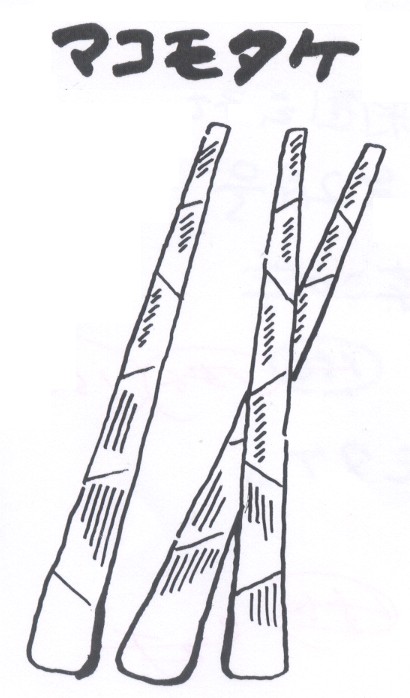 | ▼(16)マコモタケ(真菰筍)(冬2月) マコモの若い茎は、タケノコが細く小さくなったようなもの。 菰角(こもづの)と呼ばれ、これにクロボ菌の一種が寄生すると、 葉がのびなくなり、その部分が大きく膨らんで軟化。まるで柔ら かいタケノコのようになって食べるとうまい。 これをマコモタケといい、なかは真っ白で皮をむいて輪切りに し、油炒めなど中国料理に利用します。中国名では白筍(チャオ パイスン)。台湾や中国の中部では実用的に生産しているところ もあるという。 日本でも栽培してみましたが菌のつきかたが悪くできないらし いという。江戸時代の古書に掲載されていますが、これは野生の マコモに自然にできたものらしいといいます。 イネ科アシ属の多年草