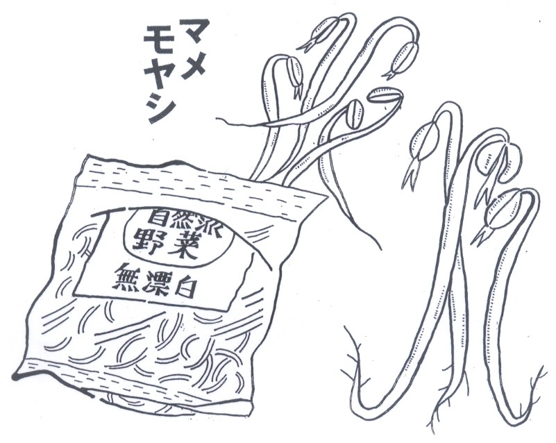 | ▼(18)マメモヤシ(冬2月) モヤシには、ダイコンやソバ、米、麦などのものもありますが、 ここではリョクトウやダイズ、ブラックマッペを用いたマメモヤ シを取り上げます。 マメモヤシは、第二次大戦中の野菜不足のとき、その対策とし て始めたのが動機。当時は観賞用の花を作ると国賊などといわれ、 使われなくなった温室を利用して作り配給しました。 マメモヤシは、豆に水を吸わせ、27〜30度Cの暗所で芽を出さ せ、水分を補給しながら数日で収穫でき年間を通じて作られます。 リョクトウもやしの栽培は古く、中国では1639年の「農政全書」 にも記載されています。リョクトウはインド原産の一年草。日本 での豆の栽培は、17世紀ごろの記録があるが、遺跡からは縄文時 代の種子も出土しています。もやしの原料は中国から輸入。 ブラックマッペ(種子名はケツルアズキ・毛のある蔓小豆の意 味)はリョクトウの近縁種で、アズキではないという。インド原 産でリョクトウと同じ遺跡から出土。昭和40年ごろからもやしの 中心になっています。原料はタイなどの東南アジアから輸入して います。 ダイズモヤシ。多く朝鮮料理や、中国料理などに利用。その他 ソラマメ、アルファルファのもやしもあります。 【効能】ビタミンCの補給。シミ・ソバカスをとり、肌や髪を潤 し、ふる血をとるといわれ美容効果によいという。漢方では乾燥 したものを生薬として元気をつけ痛みを止めるという。 緑豆:・マメ科ササゲ属の1年草 ダイズ:・マメ科ダイズ属の1年草 ブラックマッペ:・マメ科ササゲ属の1年草