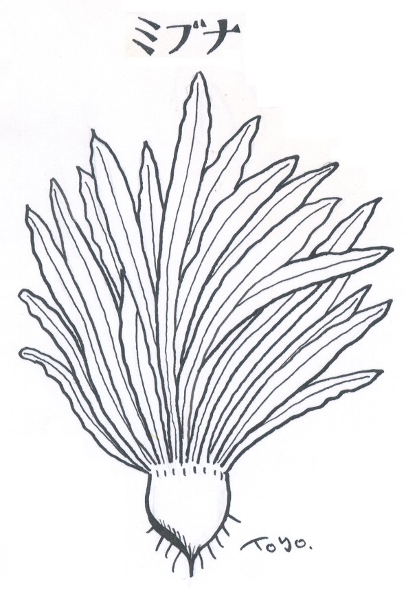 | ▼(19)ミブナ(冬2月) ミブナは壬生菜で、もと京都壬生(みぶ)村でつくられたため、 この名があるのだそうです。やはり京都付近の原産のキョウナ(ミ ズナ)の変種とかで、葉は特有のから味と香味があり、漬物用、 千枚漬けの材料になります。 下からたくさん生える根生葉は質厚く、細長く倒卵形または楕 円形で切れ込みはない。品質はキョウナに劣るとはいえ、冬から 早春の葉菜として賞用されています。 春、鮮黄色の花をつけ、花弁は狭卵形でアブラナ科であるから して、ト−ゼンながら十字花。ほかのつけ菜類よりせまく、がく は披針状。早生・中生・晩生の3系統があり、晩生ほど葉の色が 濃い。 ・アブラナ科アブラナ属の越年草