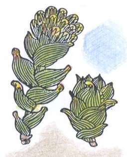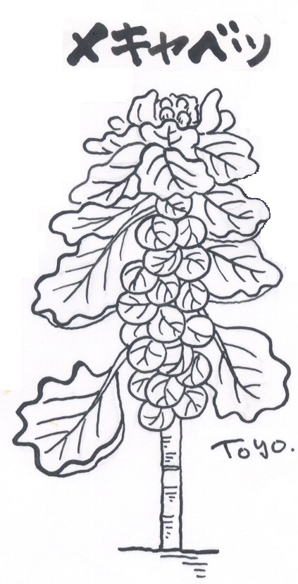 | ▼(20)メキャベツ(コモチカンラン)(冬2月) ままごと遊びの道具に喜ばれそうな小さな野菜コモチカンラン。 直径2.5センチ位のキャベツのそっくりサンがゾロゾロとなります。 子だくさんの縁起をかつぎ、あやかるようにと婚礼の席に好んで 用いられます。芽キャベツの名もあり、キャベツは大きな球を結 びますが、これは茎の葉液の胞芽が球になったもの。 普通のッキャベツでも収穫したあとの茎に、コモチカンランと 同じように小球がたくさんなることがあります。コモチカンラン はこのことから発展させたものだそうです。 原産はベルギ−地方。英名もブリュッセルス・スプラウツと原 産地の首都の名が入っています。日本へは明治の初年に渡来。煮 て、油いためでまた生食もします。甘味あり、和洋食に合います。 ・アブラナ科アブラナ属の2年生草本
