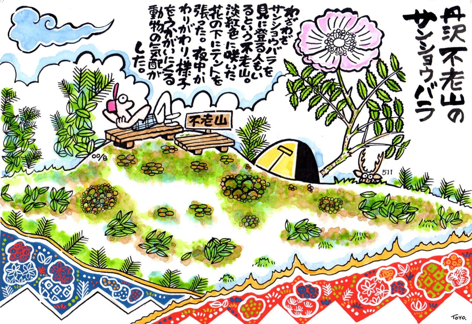 頂直下の淡紅色のサンショウバラの花の下にテントを張ってみまし