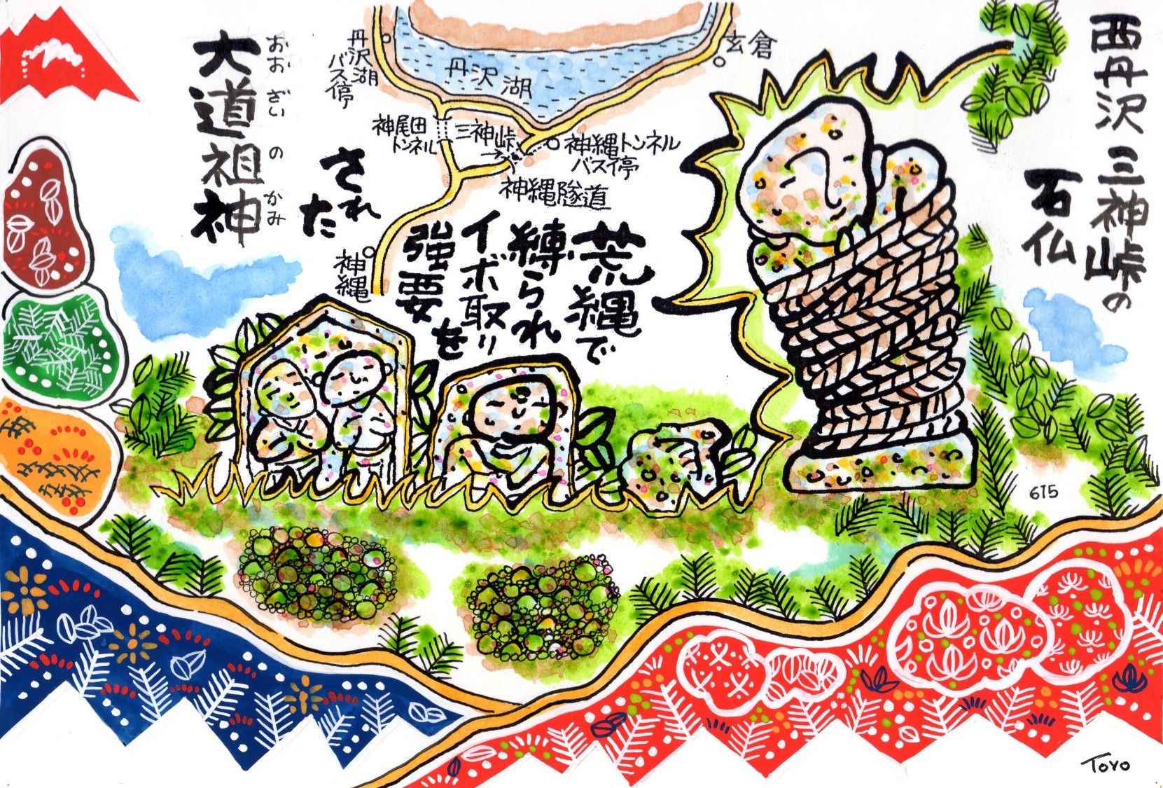 古道がったところで三神峠と呼ばれています。峠には3体の神像が