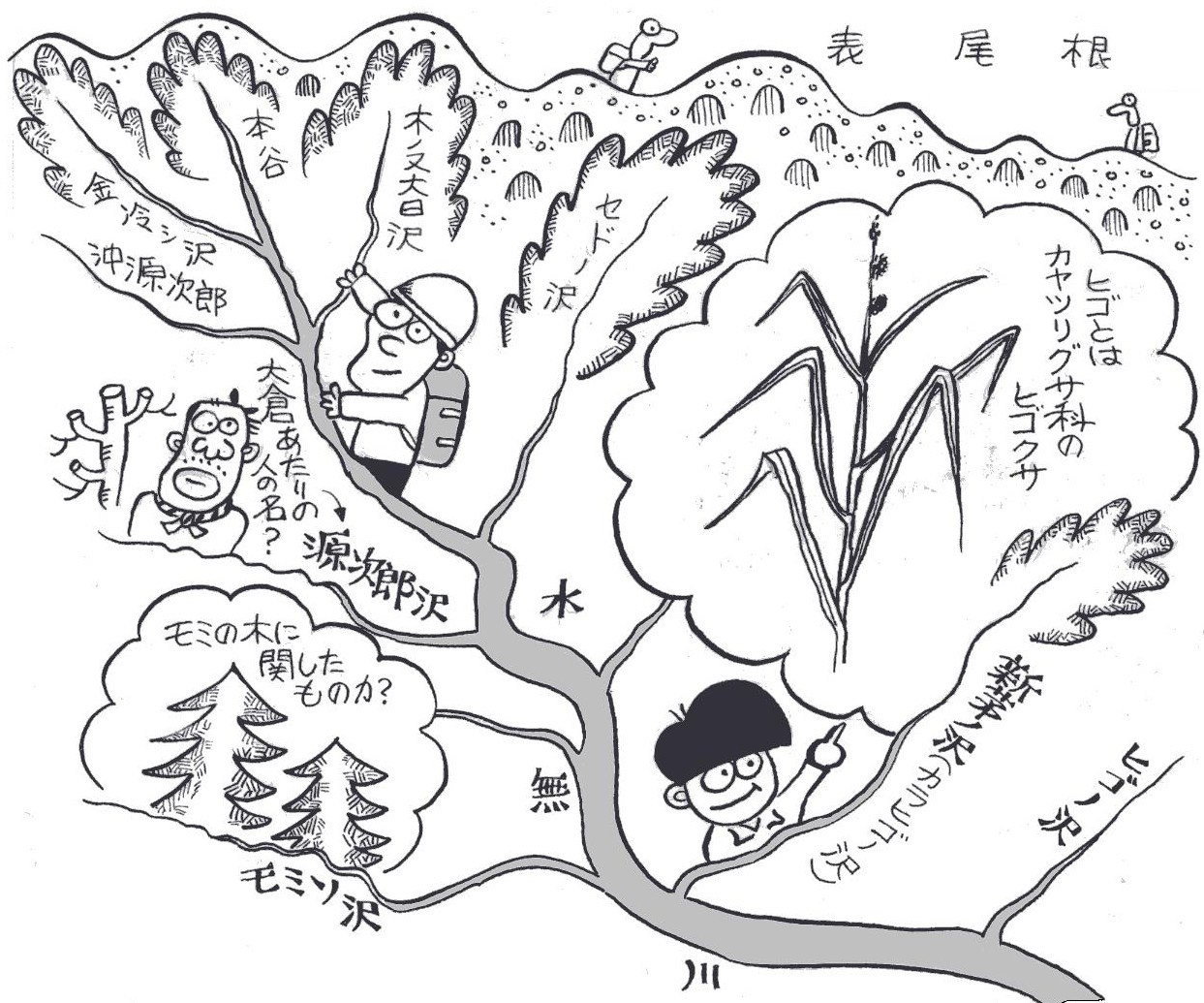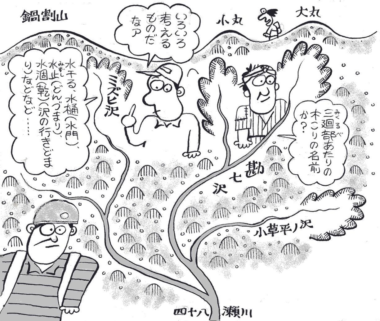 | ■(1)表丹沢の沢と川 丹沢の「タン」は谷のことで、沢も谷をいう古代朝鮮語だといい ますから、ここはまさに谷だらけ山地。丹沢といえば谷歩き、沢登 りをいうほどで、この山地を沢から始めた人は多い。 その丹沢を地図で眺めると、また訳のわからない名前の沢がたく さんあります。実際には、ほとんどが意味不明なのですが、ここで は、得意のまた聞き、孫引きをフル活用して拾い出してみました。 まずは、おなじみ水無川。大倉入り口バス停先の戸川集落のあた りから川の水が地下に浸透して流れ、地表は名前通りの水無川。そ れが下流で再び湧き水になって、名水100選の「弘法の清水」にな って現れます。 さて、沢の名前。ヒゴノ沢、モミソ沢、新茅ノ沢、(一名カラヒ ゴノ沢)は植物名からきたのだそうです。ヒゴとはカヤツリグサ科 の多年草で、細い茎がちょうど竹ひごの感じの草です。 20歳代のころ、初めて連れてこられた新茅ノ沢、まだ会社に勤 めていたころでしたが、それ以来すっかり沢のとりこになり、毎週 日曜日になると、あっちの沢こっちの沢と出かけました。その時は まだ尾根を歩くことを知らなかったのです。 それから十ン年後の夏、家族を連れて久しぶりに新茅ノ沢にやっ てきました。橋の下をくぐって最初の滝で水遊び、しかし、下の息 子はまだ小学校に入ったばかりで、この沢を登るのはちょっと無理 です。 そこで烏尾尾根を登ることにしました。そたんに息子はご機嫌な なめ、暑い尾根を暴れながら登った思い出があります。その息子も 今年は成人式を迎えます。 葛葉川。これもマメ科のクズにちなんだ名前。明るく、小滝が連 続して楽しく登れ、初級者にも人気があるのはご存知のとおりです。 四十八瀬川。普段は流れのおだやかな川ですが、ひとたび大水が 起こると、急流になり、あちこちに瀬ができたのが名前の由来です。 上流の勘七沢も小滝が多く、格好の沢登り場所。まだ結婚前のこ と。家内と二人でこの沢を登りました。若気のいたりで、カッコイ イところをみせようと張り切り、小滝で落ちたことがなつかしく思 い出されます。沢名はきこりの名ではないかという人もいます。 また鍋割山に突き上げるミズヒ沢は、水干るとか水樋(水門)、 水止(みずし・どんづまり)、水涸(乾・沢の行き止まり)などな どの説があります。 |