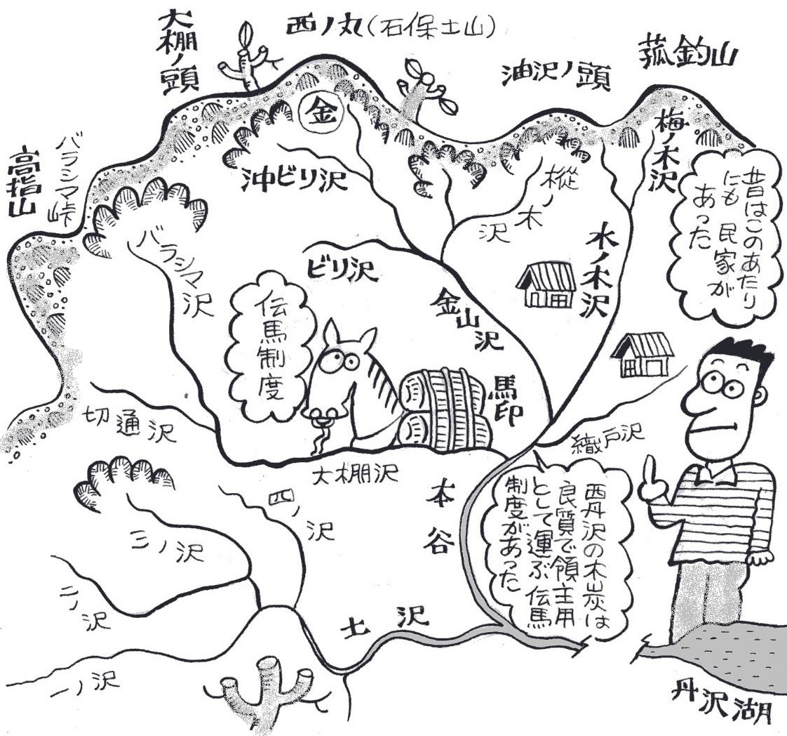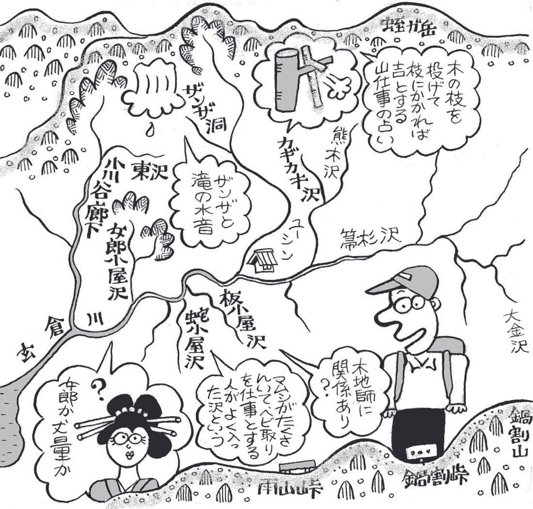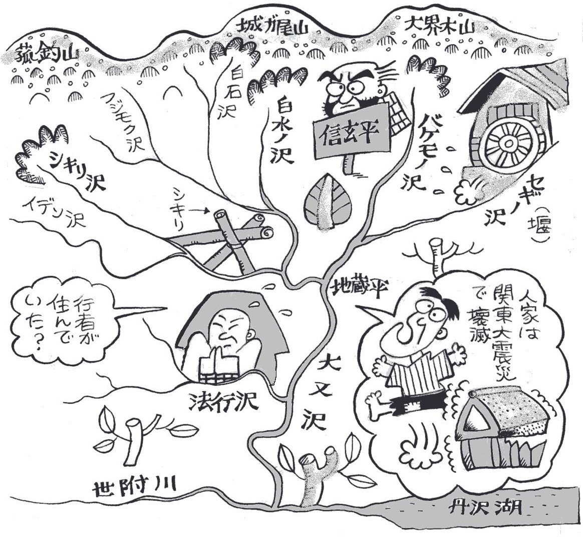 | ■(5)大又沢 世附川下流から北へ分岐する大又沢上流に、地蔵平があります。 ここを中心にして、大又沢流域にはかつて20軒くらいの人家があ ったといいます。 住民は甲州から移住した人たちで、木地師も多く住んでいました。 地蔵平から北東へ延びるセギノ沢。ロクロをまわす水車小屋をつく るために築いた「堰(せき)」からの沢名だとの説もあります。 また、北西にあるシキリ沢。シキリとは、木地師たちが丸太を鋸 で切る台のこと。山の安全を占う神事になっていたといいます。 地蔵平の分岐から城ガ尾峠に突き上げる白水ノ沢。永禄12年 (1569)、甲斐の武田信玄が道志側から城ガ尾峠を越えて相模の国 に侵入、小田原城を攻めました。そして、信玄平あたりに陣を張り、 大勢の軍兵を休ませました。 その時、大量のコメのとぎ汁が沢に流れ込み、水がまっ白になっ たといいます。それ以来、白水ノ沢と呼ばれたということです。ど うもハナシがうますぎはしませんか……。 |