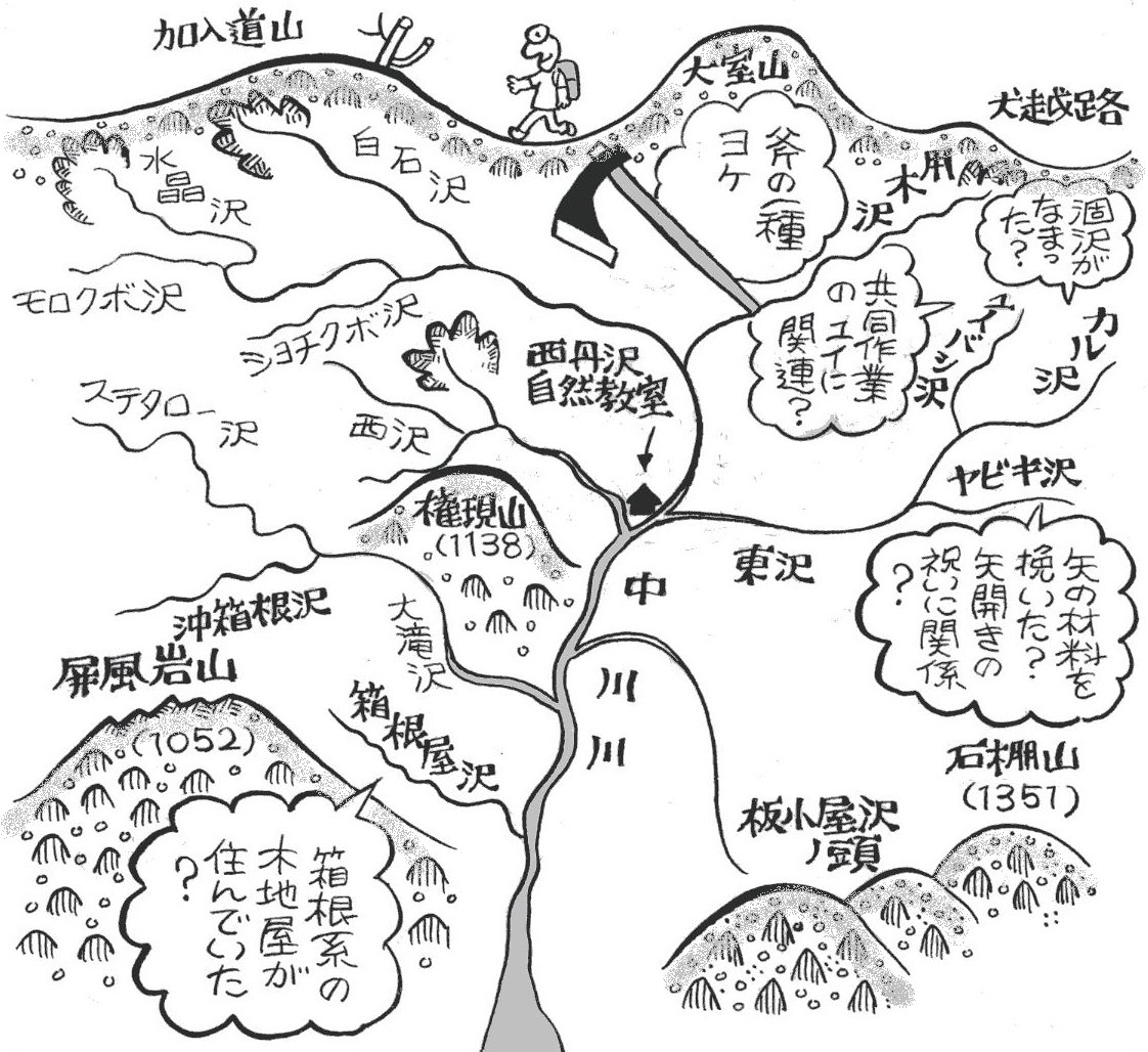 | ■(4)世附川 世附川上流の水ノ木地域にも江戸末期、小集落があったといいま す。ブナ、ミズナラ、トチなどの良木が生え、木地師の活動に絶好 の場所でした。 水ノ木沢のの流域に、民家の跡らしい平地や、本谷上部には大正 のころの墓も残っています。隣の梅ノ木沢も、かつては人が住んで いたともいわれ、その名残のウメの木が、昭和の初期まで生えてい たといい、沢の名前にもなっています。 西の丸のピークへ突き上げる金山沢。ここはその名のように、昔 は金または鉄が取れた所と伝えられます。源頭の西ノ丸は、別名石 保土(いしほど)山です。金山の近くにはホトをまつるのがかつて のしきたりだったといいますから、話が合っています。 金山沢の西側から、沖ビリ沢、ビリ沢が流れ込んでいます。ビリ とは、木地師が使う道具で、かんなの一種。S字型の刃がついてい て、沢の形からこの名がついたといわれています。沖は奥で、奥に あるビリ沢となります。 |