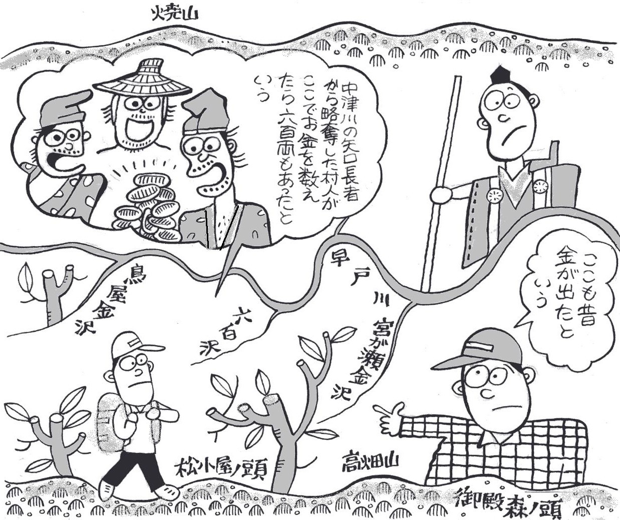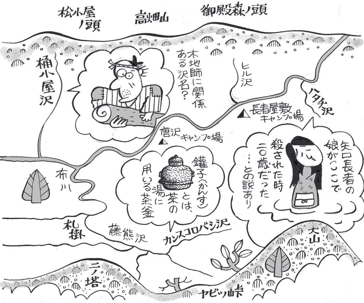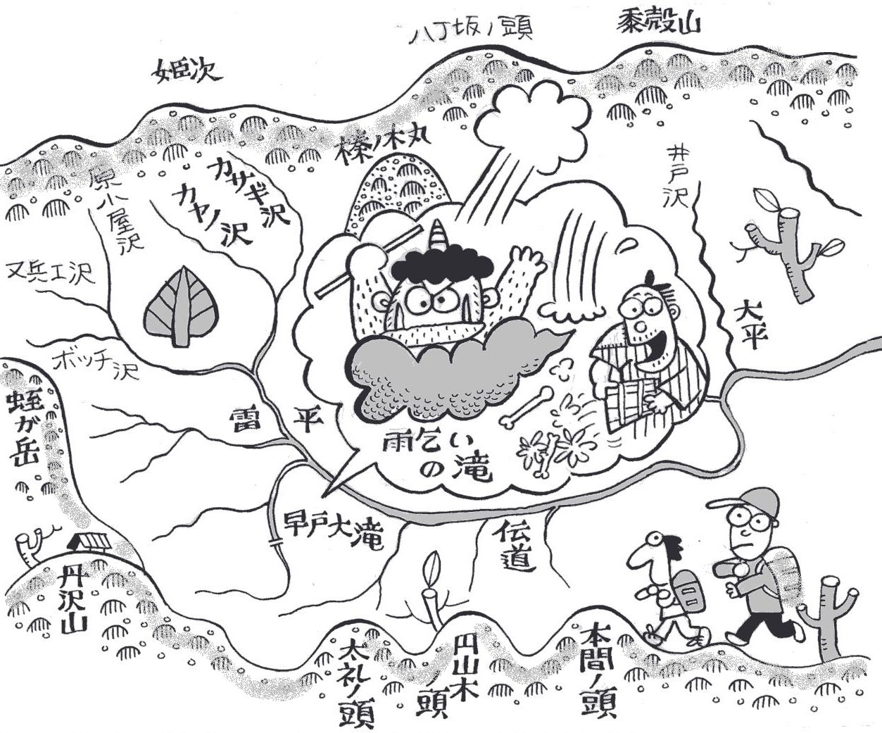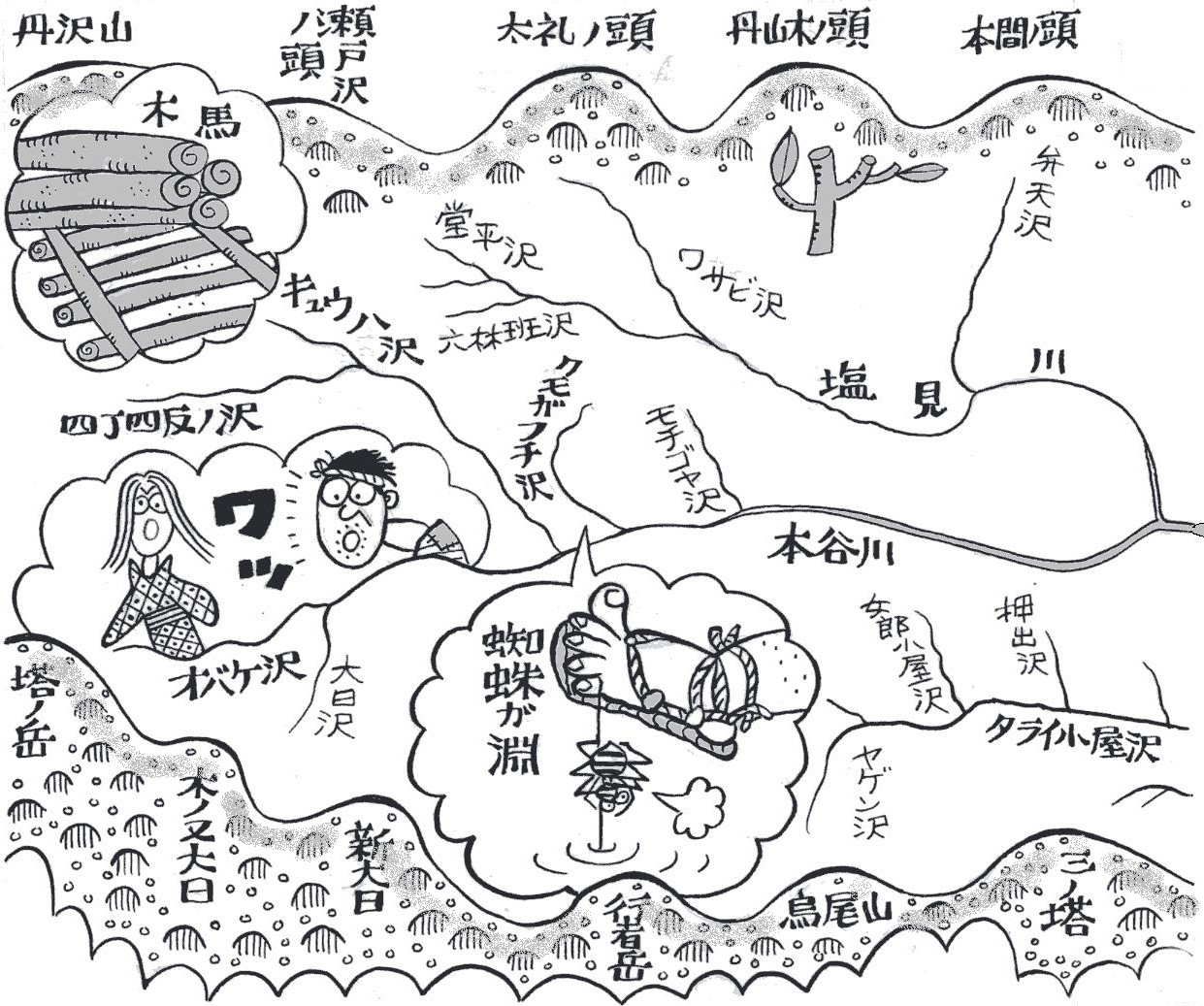 | ■(7)中津川 丹沢山から塔ノ岳、新大日に東から突き上げる中津川水系の本谷 川の沢。おもしろい名前の沢が並んでいます。 まず、丹沢山が水源のキュウハ沢。名前は、木材を運び出す時、 敷き並べてある木材の上を滑らせるソリに似た運搬具の「木馬(き うま)」からきているといいます。また、この沢は急な滝が多いと いうので「急場」がなまったのだという人もいます。 キュウハ沢の支流にある四町四反ノ沢も変わった名前です。昔、 このあたりは江戸幕府の直轄地でしたが、明治維新で国有地となり、 さらに神奈川県の県有林になりました。 その後、スギやヒノキの植林事業がおしすすめられ、この沢の流 域では「四町四反」歩に植林したといいます。長尾尾根に突き上げ る五町歩沢も同じ由来です。 また、少し下流にクモガフチ沢があります。昔、猟師がある淵の 岩の上でウトウトしていましたが、ふと目を覚ますと、大きなクモ が足の指に糸を巻きつけ、淵の水の中にたらしているではありませ んか。 猟師は、あわえて糸をはずし、そばの大きなマツの木にしばり替 えました。すると、何重にももからめたクモの糸がピーンと張り、 グングンとすごい力で引っ張りはじめ、ついに大木は淵の中に引き 込まれてしまいました。「もし、足の指にしばったままだったら… …」、ゾーッとした猟師は、一目散に逃げ帰りました。それからは、 そこを蜘蛛(くも)ガ淵と呼び、誰も近づかなかったということで す。 塔ノ岳を源頭とするオバケ沢。大正5年(1916)の初夏のこ と。丹沢御林の巡視人が、猟銃を持って大日河原(オバケ沢の名前 がなかったころは、こう呼ばれた)を歩いていました。 今のオバケ沢から日高に登る所にある堰境の奥の滝までくると、 犬が異様に吠え出します。見ると岩の陰に髪を乱した女性がいます。 まるでオバケのようです。 話しかけても狂っていて要領を得ません。その日は遅いので、明 日迎えにくると弁当の残りを置いて帰りました。翌日、猟師たちが 改めて迎えに行きましたが、もう姿はありません。何年かのち、塔 ノ岳を越えてきたのか、戸川の川の淵で、餓死しているこの女性の 死体が見つかったそうです。 |