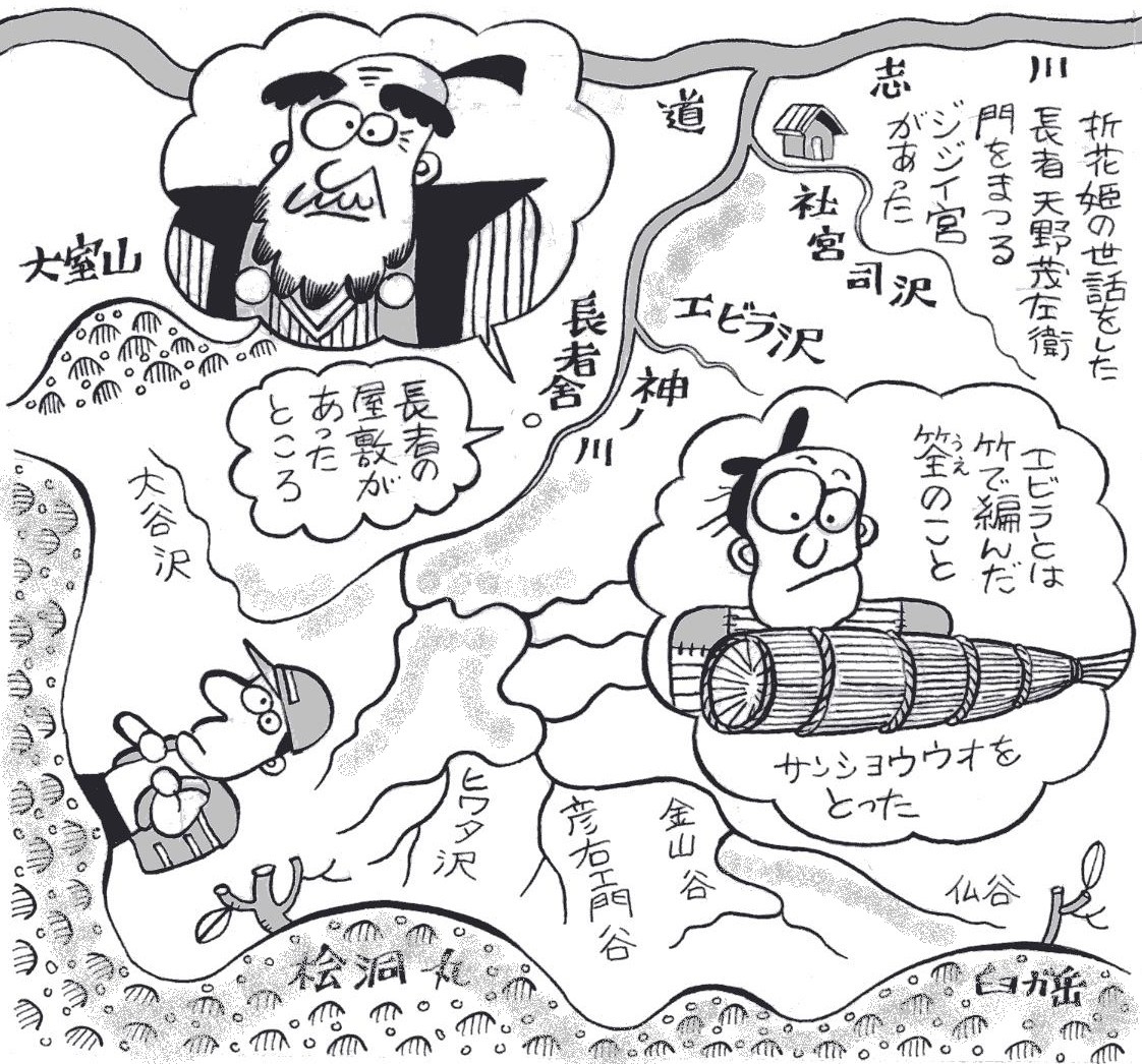 | ■(6)早戸川 ダム建設の掘削機がうなる宮ガ瀬から、西南にくい込む早戸川。 そのどんづまりの早戸大滝のお話です。 早戸大滝は、伝道から沢を登り、徒渉して至る大滝沢にかかる名 瀑。この滝は大きな滝つぼを持っていて、昔から山伏のみそぎの場 であったり、鳥尾地区の農民が雨乞いをする所でした。 その方法は、滝つぼに馬の骨や、ごみを投げ入れます。神聖な所 を汚して、わざと神さまを怒らせて雷を発生させ、雨を降らせよう とするわけです。 それと同時に、修験者が雨乞いの業法を行うと、不思議に雨が降 ったといいます。この雨乞いは、昭和34年ころまで行われてきま した。 雷平から姫次に至るカヤノ沢は、榧(かや)のことで、種子を絞 って「カヤ油」を取ったことからついた名だという人もいます。雷 平のあたりにも、古くは木地屋が住み着き、仕事のほかに良質な植 物油や、薬、塗料、打火用の油を採取していたのだそうです。 その隣の沢は、カサギ沢です。これは笠木のことで、神社の鳥居 や門、板べいなどの上に渡してある横木。とくに鳥居の上に乗って いる、そりのある木を笠木といいます。 カサギ沢のすぐ東側は、榛(はん)の木です。ハンノキは、ち密 なうえに工作しやすい良質な建築材。木地師たちは、それを利用し て神具や木祠などを制作していたのでしょうか。 早戸川には、宮ガ瀬金沢と鳥尾金沢の二つの金沢があります。こ こもやはり金鉱にまつわるもの。 明治の初め、この沢に金が出るといううわさを聞いて、いまの青 梅市から若者がやってきました。名前を柳川長吉といい、一生懸命 に金鉱を探しましたが、出てきたのは、あてがはずれて黄銅鉱ばか り。長吉は故郷に帰るに帰れず、土地の鳥尾村の娘といっしょにな り居着いてしまいました。 長吉は、どこで覚えたか、祭ばやしがうまく、村の若者に教えま した。いま津久井町串川の青山神社(8月3日例祭)に伝わる「首 長ばやし」は、その時に長吉が教えたものだということです。 |