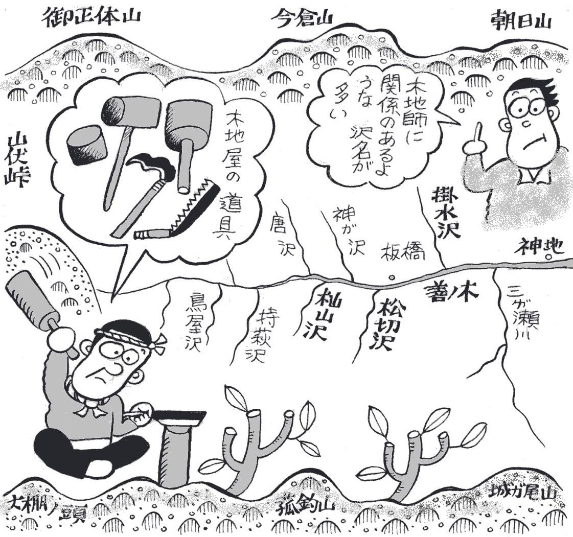 | ■(9)道志川 大昔のある夏、突然地面から富士山が湧き出たと「古縁起」とい う古い本にあります。ものすごい地響きをたて、とてつもない山の 出現ですから、まわりの村は大騒ぎです。 その中で「ひゃー、これはどうしたことだ」と腰を抜かした村があ りました。それ以来、そこを道志村と呼ぶようになったというはな しがあります。いやあ、まいったまいった。 その道志村も、木地師に関係が深いらしく、沢の名前にもうかが えます。 道志川上流の善ノ木地区に流れる掛水沢。文字どおり、切った木 材に水をかけたことからついた名前だとの説があります。木地師た ちは切り出した材を挽きやすくするため、木目をしめるのに水をか けるのだといいます。 隣の板橋地区から南に突き上げる松切沢があります。昔、木地師 は木工になくてはならない「かんな」などの刃も、フイゴを使って 自分たちでつくりました。その鍛冶仕事に使う炭は、マツが最良だ とされ、松切沢は松炭の用材を切り出した沢なのです。 |
