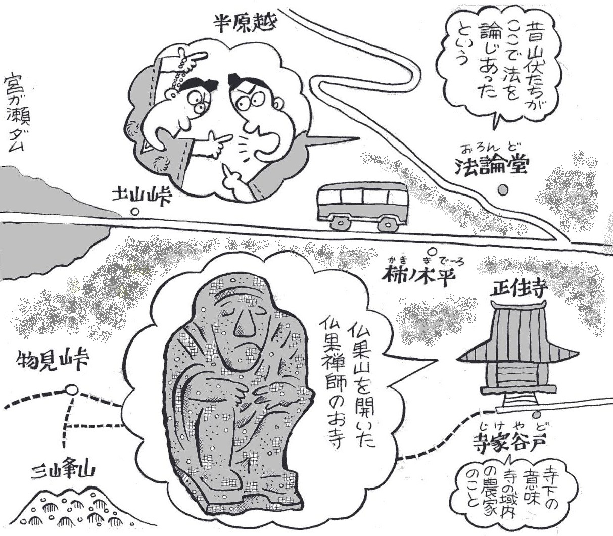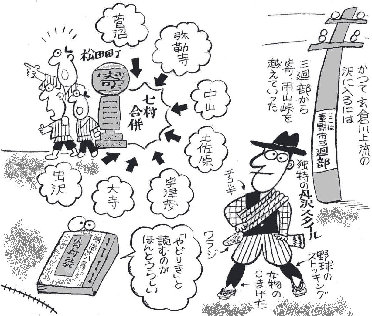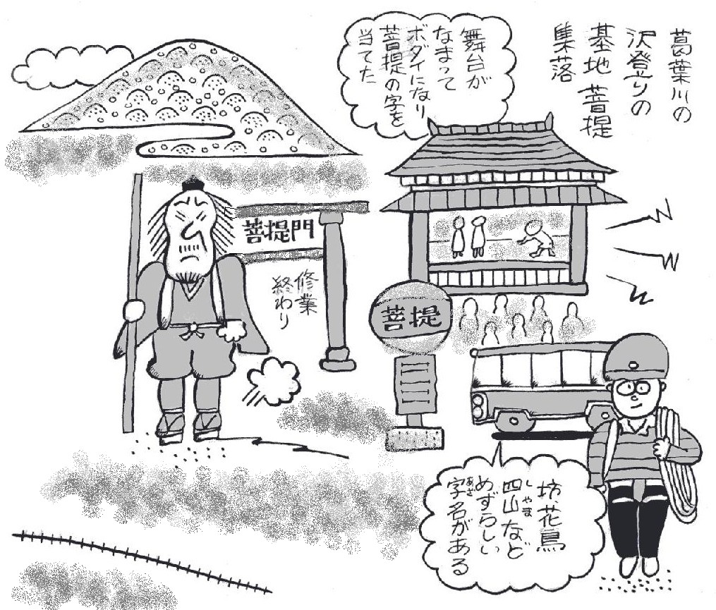 | ■(3)表丹沢登山口 小田急渋沢駅で降りた登山者は、ほとんどがバスで大倉に向かい ます。鍋割山、塔ノ岳、水無川の沢登りの人たちの出発点です。 丹沢へ行く人には、本当におなじみの渋沢。室町時代からあった 村だそうで、かつて雑木が生えた沢(柴沢)を開拓してできた村。 シバがなまってシブになったといいます。 また・室川沿いの両岸が追ったしぼんだ地形「しぼ沢」説、また、 シプガキの産地だから、そしてまた、鉱物性染料の渋を含んだ沢が 流れるからだという説などがあります。 バスの終点大倉です。沢 登り用のワラジ、杖、バッジや食料品の売店が並んでいます。 このあたりは秦野市堀山下という所。南北朝の貞治年間(136 2〜68)ころからの村で、当時は堀山影と書いて「ほりやました」 といっていたと、古い記録があります。それがいつしか堀山下とい う字をあてるようになりました。 また、大倉尾根の堀山の付け根にあたるところからきたという説 もあります。昔、山仕事で入る山は当然ながら堀山です。堀山は、 渋沢、堀川など5ヶ村が共用する入会山。村々の暮らしを左右する 入会権をめぐり、過去に何回かの紛争があったともいいます。 江戸時代、ここいら一体が金沢藩主米倉丹後守の領地だった時、 殿さまの米を入れる大きな倉が建っていました。村人はそこを大倉 と呼び、ついに地名になったといいます。 また、木地屋に多い「小掠さん」という姓にちなんだものだとか、 いやいや、クラは谷川岳の一ノ倉のように、岩とかガケのことで地 形からきているのだと諸説が紛々としています。 登山者はそんなことにおかまいなく、そそくさと急ぎ足で山道に 消えていきます。 葛葉川本谷の沢をやる時、入山口になるのが菩提集落です。民家 をぬうようにして桜沢橋へ向かいます。 菩提とは舞台のなまったもの。その昔、精霊送りの時に歌舞が行 なわれ、舞台がかけられたといいます。また、山伏が修行を終えて 出てくる所を菩提門ということにちなむという説もあります。地名 にはいろいろ深い意味があるものです。 |