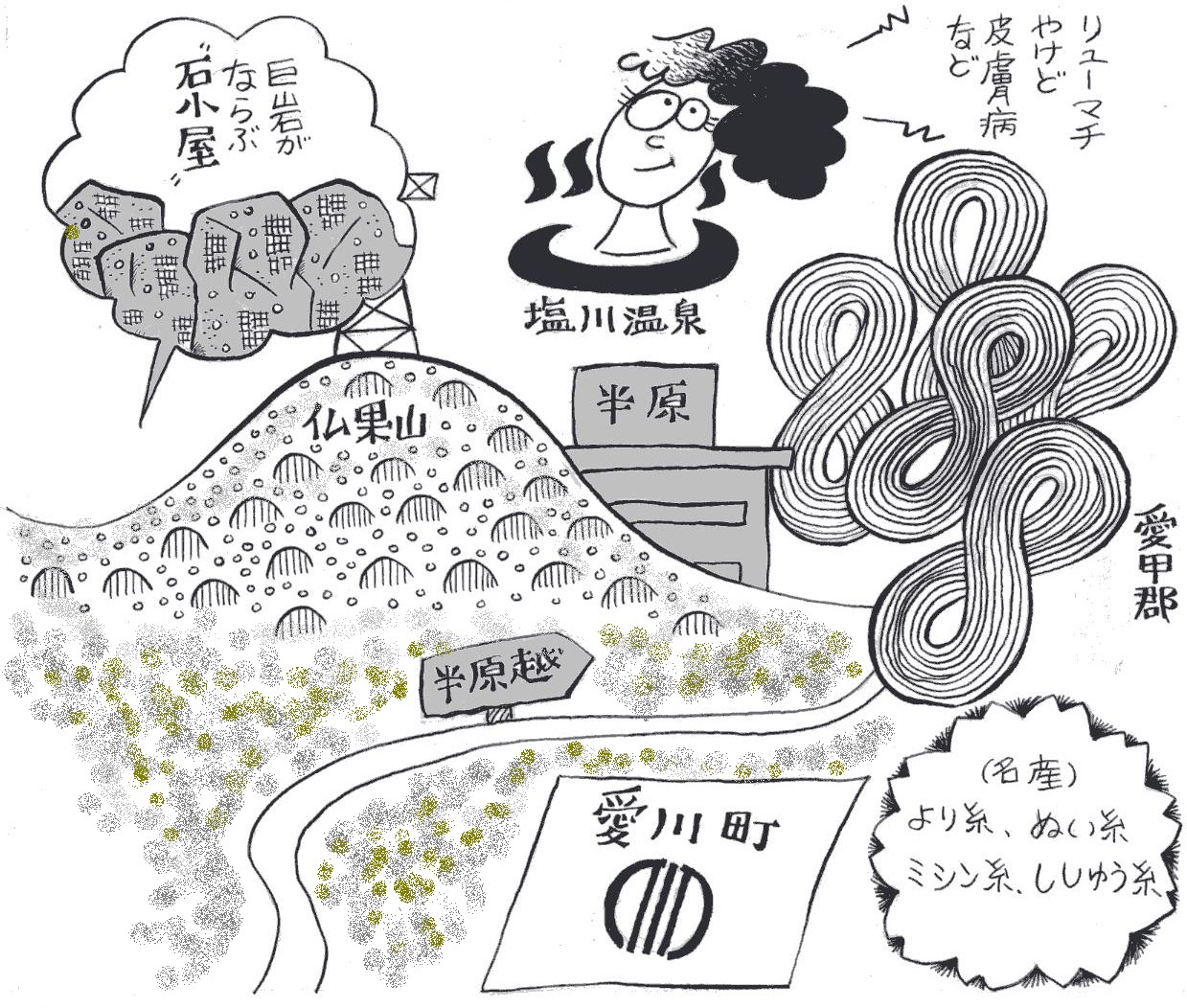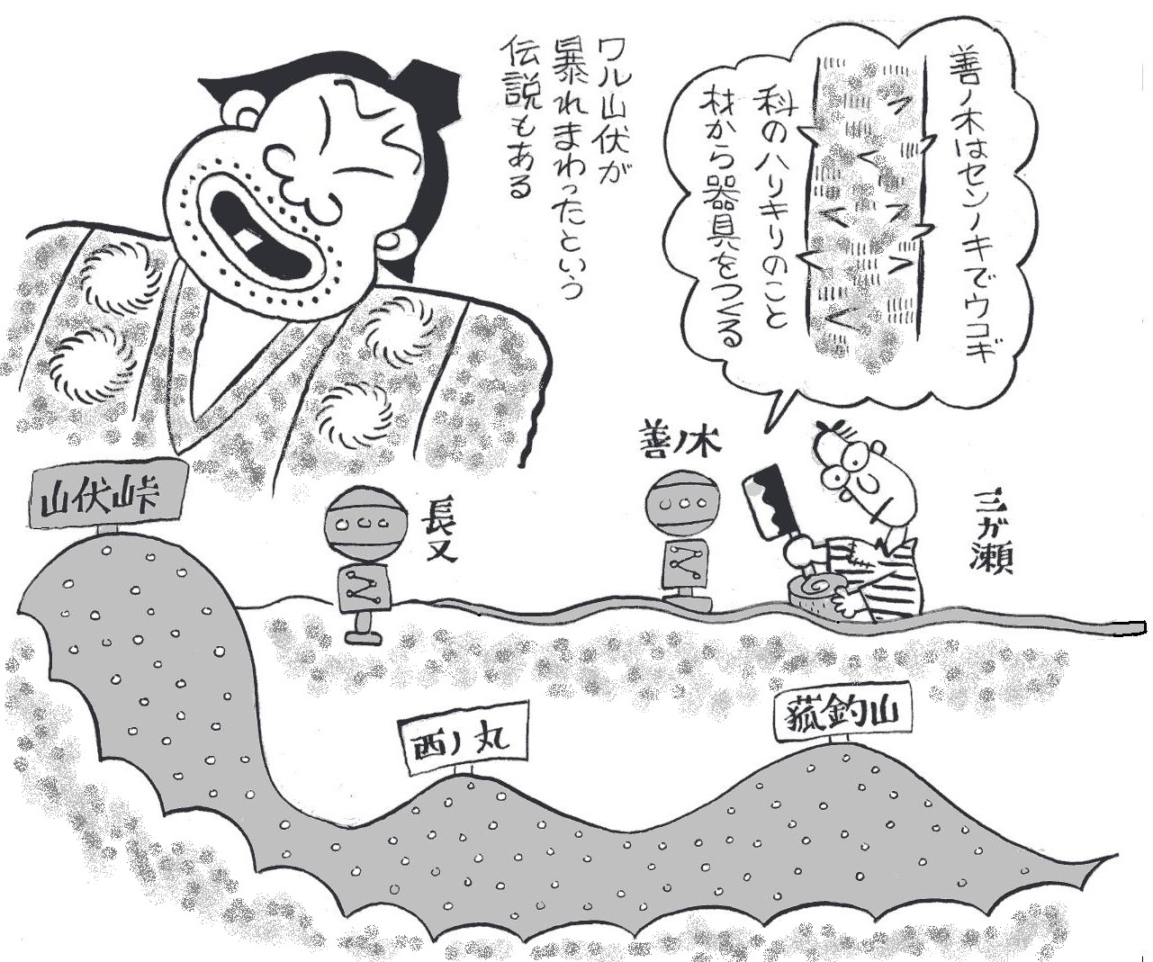 | ■(6)東丹沢登山口 仏果山への基地、愛川町半原。半原は戦国時代からの地名で、集 落の半分が原っぱなので半原。また、半分がバラ(茨)山だから、 いや榛(はん)の木が多い原で榛原。それがなまって半原になった といいますが、本当は開墾に適した地をハシバといいその原っぱ一 ハシバ原が語源だろうといわれています。 半原は古くから撚糸工業の街として有名で、かつては「半原撚糸」 の名で絹織物、絹撚糸がつくられていましたが、いまでは合成繊維 撚糸が盛んで、とくにミシン糸、仕付け糸などの撚糸部門は全国産 高の70%を占めているのだそうです。 半原バス停から西へ歩いて30分にある石小屋と呼ばれる所は、 中津川のV字谷の美しい渓谷。清流と山の緑、巨岩群で観光地にな っています。江戸時代から半原村といいましたが、明治22年(1 889)、愛川村に編入され、昭和15年から愛川町になりました。 なお、愛川とは、ここを流れる中津川の別称、鮎川の転化したもの だそうです。 丹沢三ツ峰から丹沢山への登山口は宮ガ瀬です。宮ガ瀬といえば ダム。標高155m(堰提411m)の重力式大型ダムとかで、水 量2億トンで箱根芦ノ湖と同じ。昭和44年に建設省が構想を発表、 現在は突貫工事中です。宮ガ瀬の274戸は湖底に沈むため、移転 しました。 宮ガ瀬は鎌倉時代、永仁2年(1294)の足利尊氏の父貞氏の 書に出てくるほどの古い集落。煤ヶ谷と同じ清川村ですが、辺室山、 物見峠の登り口にあたる土山峠から北側をいっています。 宮ガ瀬から南へ林道沿いに長者屋敷キャンプ場があります。ここ が宮ガ瀬の開発人矢口入道信吉の長者屋敷にちなんだ所。 矢口信吉は、西丹沢城ガ尾峠を越えて甲州へ落ちていった新田義 興の一族。義興の他界後、一族郎党と一人娘を連れて丹沢の山深く 隠れ、御殿をつくって住みました。 しかし、中津川に流したお椀から、宮ガ瀬の村人に見つかり、鬼 の住処と間違えられ、村人たちに襲われて全滅。一人娘も北側の御 殿ノ森まで逃げましたが、追いつめられて金のかんざしで自害しま した。御殿森ノ頭にある祠はこの娘をまつったものだそうです。 |