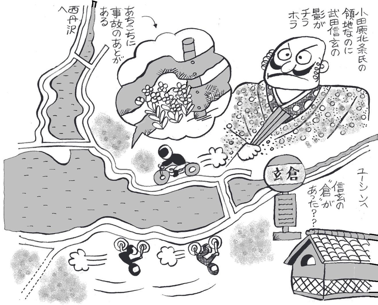 | ■(7)西丹沢登山口 小田急新松田駅からのバスの終点、その名も西丹沢。登山者は檜 洞丸、大室山、畦ヶ丸と、それぞれ目的の山を胸に自然教室方面へ 車道を歩きます。 バス停のあたりは箒沢の集落です。その昔、ここは鰐口伊賀守と いう武士の一族の隠れ里でした。この武士は、平安末期から鎌倉初 期にかけて権力を誇った奥州平泉の豪族藤原秀衡(ひでひら)の家 臣。主家の没落後、山梨県道志村の馬場地区から加入道山と破風口 の間の馬場峠を越え、神奈川県側に下り、箒沢に安住の地を求めま した。 いまは、この馬場峠から道志村大椿へ道が延びていますが、昔は 馬場地区へ通じていて、道志村とは深い交流があり、道志の娘たち は多く箒沢へ嫁いでいったといいます。 一方、箒沢から神奈川県側への下流、中川村の村人は、自分たち がいちばん山奥に住んでいると思っていました。 ところがある日、中川川で魚を釣っていると、上流から箒が流れ てきたので、村は蜂の巣をつついたような大騒ぎ。「さては川上に 鬼でも住んでいるか」。村人はおそるおそる正体を確かめにでかけ ました。 すると、大きな箒のようなスギの木の下に家が数件建っています。 まぎれもない人間の住む集落です。中川村の人たちは、箒が縁で見 つけたこの村を箒沢と呼び、それから、二つの地区は交流するよう になりました。 さて次は、その中川のおはなしです。中川は戦国期から記録のあ る地名で、明応四年(1495)の北条早雲の小田原城進出にとも ない、ここ中川領主河村氏も小田原北条の支配下に入ります。 そして、丹沢山地の村々には、小田原城を守るため、湯ノ沢城、 大仏城、中川城など、北条氏の支城が築かれました。中川には、北 条氏の重臣遠山左衛門尉景政という人が滞在しました。 天正18年(1590)、豊臣秀吉の小田原城攻めの開始時、秀 吉は中川、世附、黒蔵(玄倉)に乱暴を停止の保護をし、この一帯 を掌握しようとしたことが、豊臣秀吉掟書にあるそうです。 中川村は明治42年(1909)、三保村に編入、昭和30年の 町村合併で山北町になりました。 |