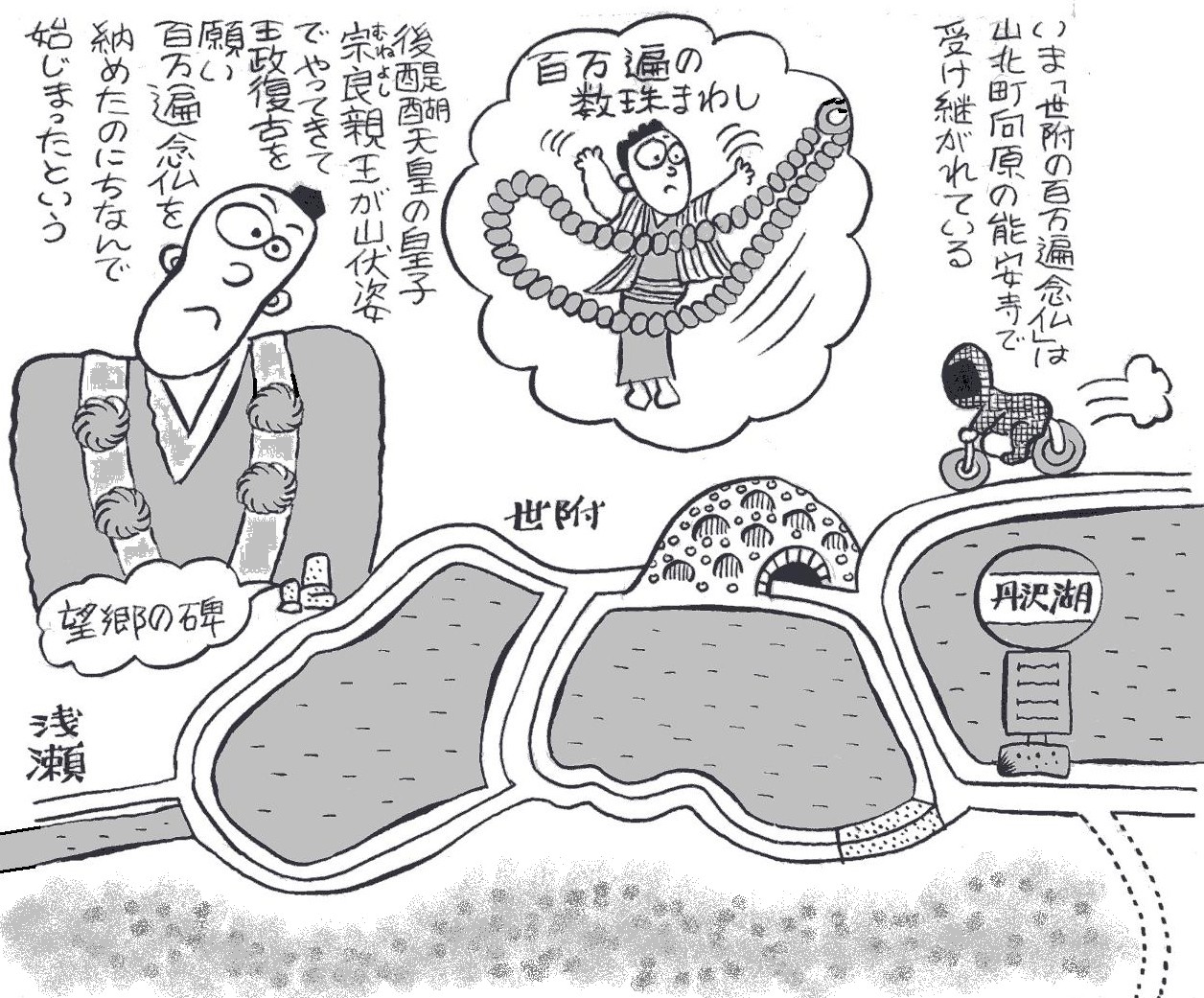 | ■(8)丹沢湖周辺 西丹沢に広がる丹沢湖。昭和53年に三保ダムが完成してできた 人造湖で、面積2,18平方キ`、総貯水量6490曼立方m。神尾田、 世附、焼津、大仏、玄倉の223戸が水没、1026人が移転しました。 三保ダムは総工費823億円土質遮水壁型ロックフィル・ダムとか で、洪水調節、水道用水、発電(最大7千キロワット)の多目的ダ ムなんだそうです。三保ダムの名前は明治42年(1909)に中 川、世附、玄倉が合併してできた旧三保村からきたものとか。 丹沢湖の東端はユーシンへの入り口、玄倉です。昔は、黒蔵とも 書き、戦国時代から記録があり、豊臣秀吉の掟書にも登場していま す。玄倉とは、ここに武田信玄の金山掘り出しの倉、または食糧の 倉があったのに由来するといいます。しかし、ここは小田原北条氏 の支配下で、むしろ武田氏の敵方の地です。ちょっとマユツバか? また、玄倉川の上流は深い谷で、こんな所をクロと呼び、切り立 つ両岸の岩を表すクラ(谷川岳の一ノ倉沢のように)をつけたのだ という説もあります。 またまた、クロクラは倶廬倶羅(くろくら)で、倶廬は倶留孫の 転化、倶羅は舎利塔の凡語だという説。つまり、この村の内でもあ る塔ノ岳のお塔は倶留孫の舎利塔で、ここはその村、倶廬倶羅村だ というわけです。実際、尊仏さんおお祭りには、お参りに行く人た ちで玄倉の谷はにぎわったそうです。 丹沢湖の西側は世附です。地元の人は「ゆづく」と呼ぶと聞きま す。ここも、豊臣秀吉の掟書で、「百姓に当地への還往を命じ、併 せて保護のため乱暴を停止」した所。昭和49年、三保ダムの建設 予定地として集落全体が水没するため移転。代々伝わってきた「世 附百万遍念仏」は山北町向原に受け継がれています。 ある秋、この丹沢湖一周を歩いてみました。バイクに乗った若者 が大勢、湖畔を何回も競争しています。事故があったのか、所々で ガードレールがひんまがり、花を供えてあるしまつ。かつては生活 道路であったのか、舗装道路が湖の中へ続き、そのわきにエノコロ グサが並んでいるのが印象的でした。 |