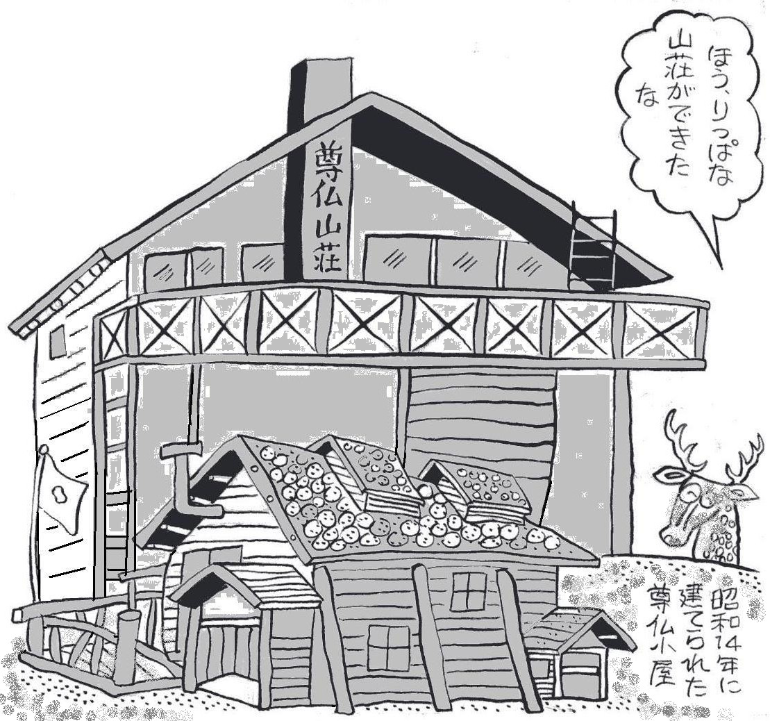 | ■コラム「丹沢の山小屋」 丹沢山塊で最初にできた山小屋は、やはり塔ノ岳頂上にある尊仏 小屋です。尊仏小屋は、昭和14年11月、横浜山岳会の手で建て られ、工事費は当時のお金で4800円ナリ。これをいまのお金に 換算するには七千倍するとかで、ざっと3300万円。 礎石は塔ノ岳の東側のオバケ沢から手送りで搬出。材木は山の西 側、鍋割沢で製材されました。資金の調達もたいへんで、横浜山岳 会の会員の拠出金のほか、地元の山岳会や有志から募金したのだそ うです。こうして建てられた小屋も、昭和10年ころになると、屋 根ははがれ、床板や羽目板は心ない登山者に燃やされ、骨組だけの 残がいばかり。 昭和24年、小田急尊仏小屋ができ、管理人もおくようになりま す。そして、昭和30年の神奈川国体を契機に、尊仏小屋の隣に県 営尊仏山荘が完成、原小屋平に原小屋山荘、神ノ川に長者舎山荘が 建設されます。その後、尊仏小屋は2回ほど改修、県営尊仏山荘も 昭和62年に建て替えられました。 |