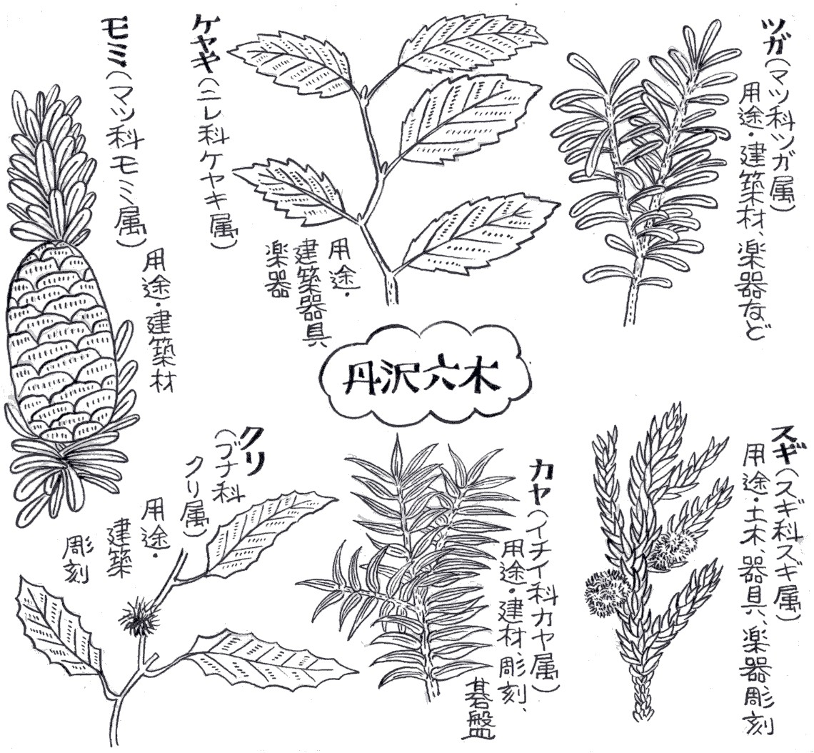 なかでも、ツガ、ケヤキ、モミ、スギ、カヤ、クリ、の六種は「丹