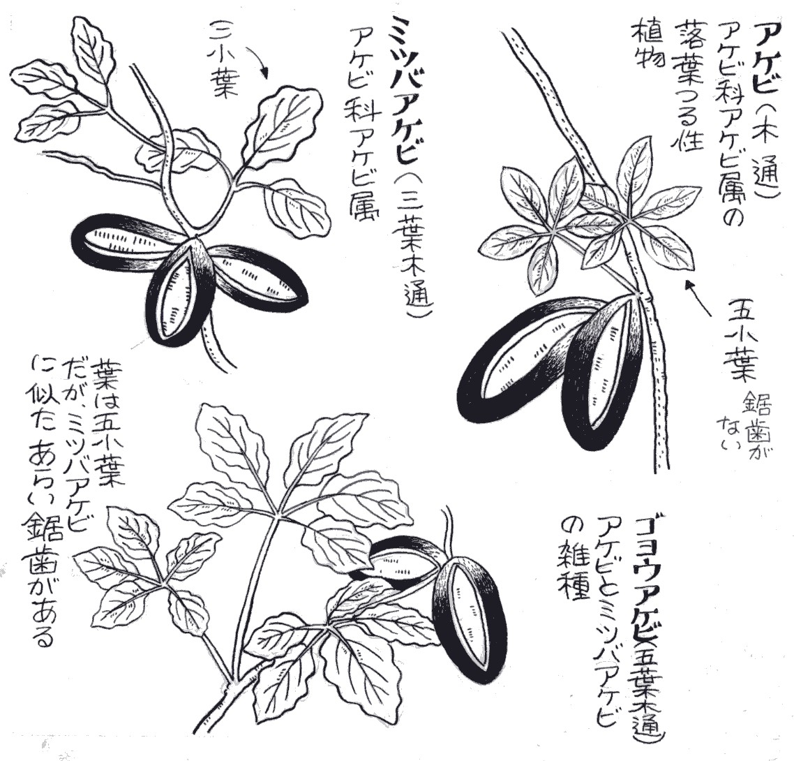 通、アケビといわれるもののほか、これと同じ小葉が五枚あるゴヨ