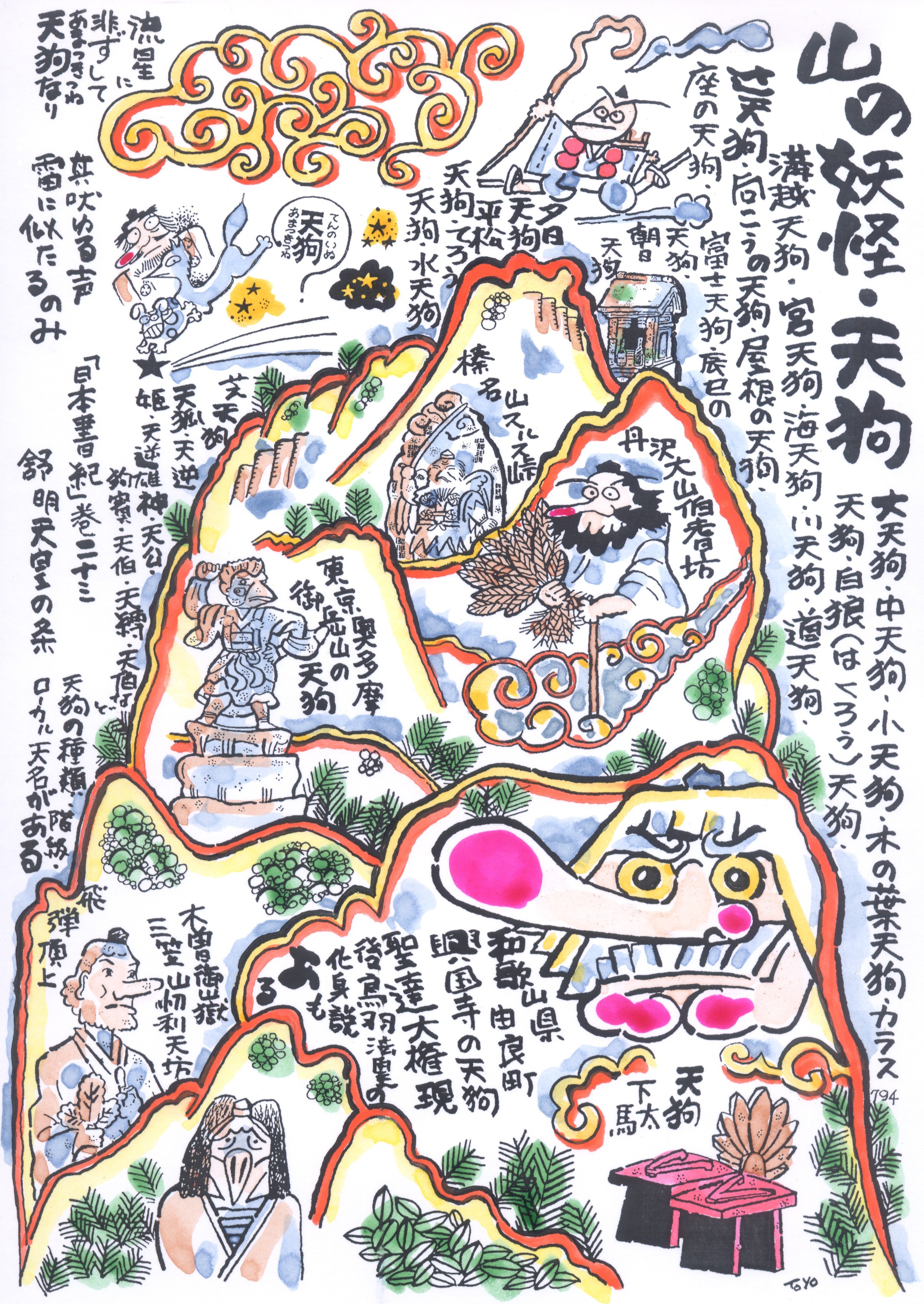| ▼03:天狗の階級・格 【本文】 鼻が高くて、赤ら顔でおっかない顔をして、山伏のような姿で一本 歯の高いげたをはいて羽うちわを持って空を飛ぶ。これらはみんな 「大天狗」です。 これと違って、とがったくちばしのある天狗は、カラス天狗、また は小天狗です。カラス天狗はふつう青色の顔をしています。その中 間が中天狗。古い川柳に「ありそうでないのが中天狗」というのが ありますが、実際にはいるそうです。 これが天狗の階級で、気ままな天狗も階級で縛られていると思うと 愉快です。いちばんの大物はやはり大天狗、以下中天拘、小天狗、 木の葉天狗、白狼天狗(はくろうてんぐ)、溝越天狗(みぞこして んぐ)とつづきます。 最下位の溝越天狗は空を飛ぶ術が、まだまだ未熟で溝を飛び越すの がやっとレベル。ときどきポチャンと泥水に落ちるという落ちこぼ れ天狗です。大天狗でも、名前がついていない天狗が多いなかで名 前が知られている天狗はそれこそ大物の天狗です。 これらの大天狗は簡単には姿を見せないそうですが、小天狗や木の 葉天狗などは、狗賓餅(ぐひんもち)といって猟師や木地師など山 仕事の人が、自分たちに供える餅が少ないといっては腹を立て、よ くいわれる「天狗倒し」を演じたり、木を切る邪魔をしたり、岩や 石を谷底へ蹴飛ばしたり、川の魚を捕って喰ったりすると、古書に あります。いたずら天狗など、よく民話に出てくる天狗譚はこれら の種類です。 また、天狗の種類としては、宮天狗、海天狗、川天狗、道天狗、辻 天狗、辰巳天狗(たつみてんぐ)、朝日天狗、夕日天狗、水天狗、 向こうの天狗、屋根の天狗、座の天狗、富士天狗、平松天狗、てろ う天狗がいるといいますから、そこら中にいることになります。 大物大天狗の中でも、ド超大物は、ご存じ京都・鞍馬山の天狗、同 じく京都の愛宕山の天狗、奈良県・大峰山の天狗、滋賀県の比良山 の天狗、長野県・飯縄山の天狗、福岡県・彦山(英彦山)の天狗、 神奈川県・丹沢大山の天狗、香川県・白峰の天狗が有名です。これ らにすむ天狗を日本八天狗というそうです。 また天狗の中の変わり種として、長野県の奇天烈な石仏で有名な修 那羅山には、女性の天狗の石仏があります。石像は半分裸で鼻も高 くなく、天狗の形はしていません。ただ像の両脇に「婆羅門 女天 佝」とあり、「狗」がニンベンになっています。 さらに山形県羽黒山には、水天狗円光坊という天狗がおり河童天狗 などともいっています。この天狗は羽黒山開運「七千日護摩行者長 教」の護符(ごふ)に、もう一狗の羽黒山三光坊とならんで影像が 出ています。 ▼【参考文献】 ・『奥多摩の世間話』渡辺節子著(青木書店)2010年(平成22) ・カラス天狗のミイラ(和歌山県御坊市歴史館所蔵) ・『今昔物語集』(巻第二十):日本古典文学全集24『今昔物語集3』 馬淵和夫ほか校注・訳(小学館)1995年(平成7) ・『信濃昔話集』:(『図聚天狗列伝・東日本編』所収) ・『新著聞集』椋梨一雪原著、神谷養勇軒編。:(『日本随筆大成第 二期第5巻』日本随筆大成編輯部編(吉川弘文館)1994年(平成 6)所収 ・『先代旧事本紀』:『旧事本紀』(くじほんぎ):『天狗の研究』所 収 ・『図聚天狗列伝・東日本』知切光歳著(三樹書房)1977年(昭和 52) ・『図聚天狗列伝・西日本』知切光歳著(三樹書房)1977年(昭和 52) ・『仙境異聞』平田篤胤。別名《寅吉(とらきち)物語》。1822年(文 政5)成立。 ・『天狗の研究』知切光歳(大陸書房)1975年(昭和50) ・『太平記』:新潮日本古典集成『太平記4』山下宏明・校注(新 潮社)1991年(平成3) ・『天狗の研究』知切光歳(大陸書房)1975年(昭和50) ・天狗のミイラ (「バケモノの文化誌」) ・特集「山と渓谷」03年11月号企画「山の民俗に親しむ」 ・『日本山名事典』徳久球雄ほか(三省堂)2004年(平成4) ・『日本書紀』(巻第二十三):岩波文庫『日本書紀4』坂本太郎ほ か校注(岩波書店)1996年(平成8) ・『日本神話伝説伝承地紀行』(吉元昭治著)(勉誠出版)2005年(平 成17) ・『日本石仏事典』庚申懇話会(雄山閣)1979年(昭和54) ・『日本大百科全書6』(小学館)1985年(昭和60) ・『日本未確認生物事典』笹間良彦著(柏美術出版)1994年(平成 6) ・『宿なし百神』川口謙二著(東京美術刊)1979年(昭和54) |