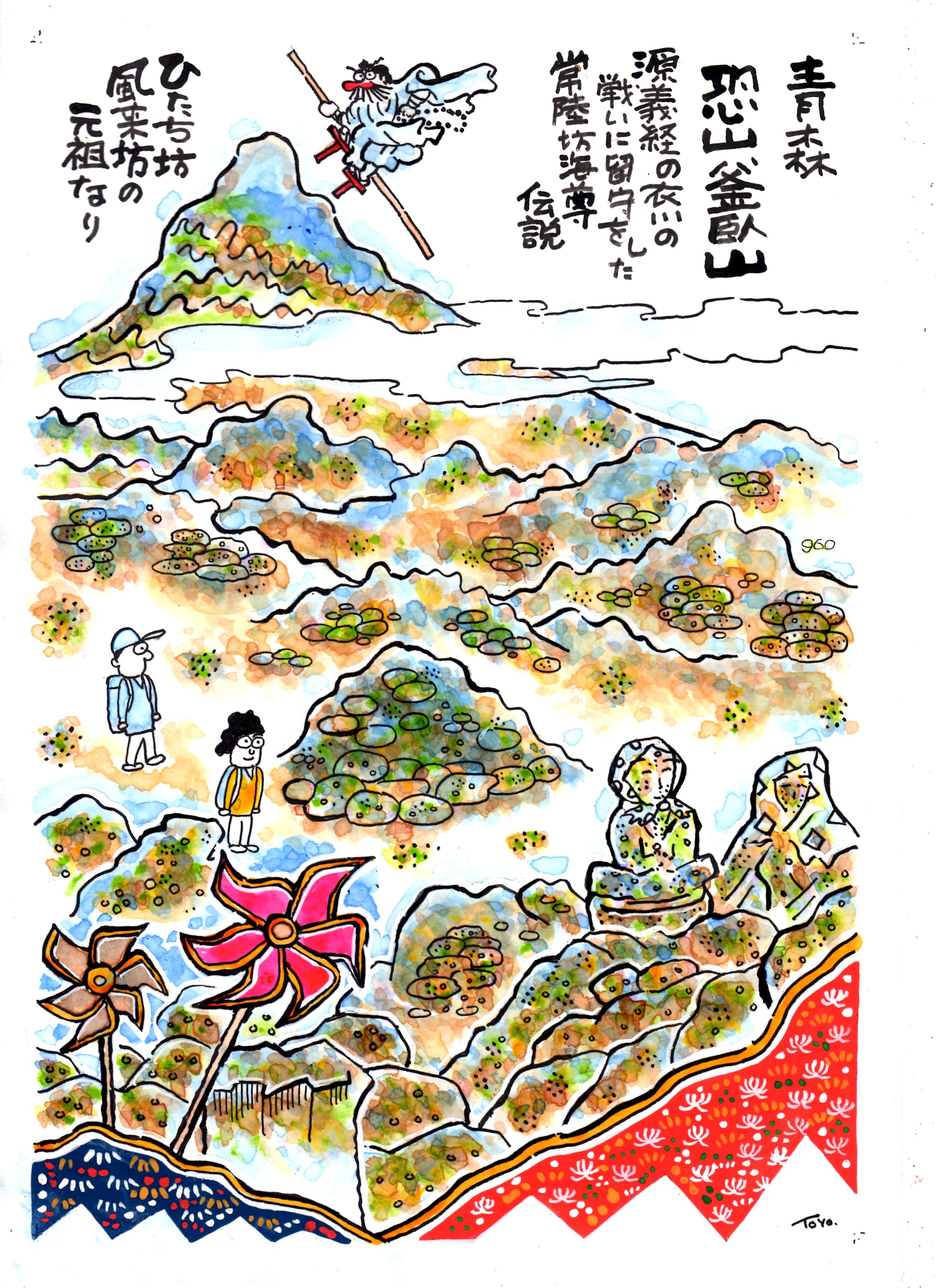 | ▼16青森・恐山の天狗「常陸坊海尊」 【本文】 修験道の最北青森県下北半島の霊山恐山は、恐山火山を中心とす る霊場の総称。於曽礼山、鵜翻(うそれ)山、地獄山、焼山、釜覆 山などの異名もあり、死者の山として知られています。日本三大霊 場(比叡山・高野山・恐山)(「日本三霊山」の富士山・白山・立山 は別)のひとつ。 カルデラ湖である宇曽利(うそり)山湖の北岸一帯は、硫黄や間 欠泉が噴出して草木も茂らない地獄の風景になっています。恐山は 宇曾利山とも「おそれやま」ともいっています。このうそりとか、 おそれの語源由来は分からないそうですが、オソ、アソはアイヌ語 の噴火を表す語ともいう。 カルデラの周囲を蓮華八葉(れんげはちよう)の火口丘や外輪山 が囲んでいます。蓮華八葉は、(1:剣山(400m)、(2:地蔵岳 (330m)、(3:鶏頭山(321m)、(4:円山(まるやま・897m)、 (5:大尽山(おおつくしやま・828m)、(6:小尽山(こつくし やま・513m)、(7:北国山(844m)、(8:屏風山(628m)の 8峰。 さらに南には下北半島の最高峰の釜臥(かまふせ)山(878.6m) が、西には朝比奈岳(874m)がそびえています。カルデラ中央に は宇曾利山湖(恐山湖)があり、北東端から流れ出す川は、正津川 (しょうづがわ・三途の川)と呼ばれています。 ここは死者の魂が集まるところとされ、夏には多くの人が死者の 霊を呼ぶイタコの「口寄せ」を聞きに集まります。ただイタコの「口 寄せ」が行われるようになったのは、明治末年から大正初年ごろか らだという。湖の北岸には女郎地獄とか血の池地獄、賽の河原など が広がり、またそれらを背に極楽ノ浜もあります。 この地獄と極楽を含む霊場全山をまとめて恐山菩提寺と総称さ れ、中心となっているのは地蔵堂。本尊は慈覚大師円仁(天台宗) 作と伝える地蔵菩薩で、江戸時代以降、むつ市田名部(たなぶ)新 町の曹洞宗円通寺の支配下に置かれているという。外輪山の南方に 接して寄生火山の釜臥山があり、恐山の奥の院になっています。 『奥州南部宇曾利山釜臥山菩提寺地蔵大士略縁起』(『山岳宗教史 研究叢書17』)(1810年・文化7年に再刊)という文書によれば、 そのムカシ慈覚大師円仁が中国で修行中、「或夜、霊夢あ利、一人 の聖僧、忽然と現れ、大師に告て曰、汝本国に皈朝(帰朝)の後、 当東方而去其王城行程三十余日許(ばかり)にして、乃在霊山。…」。 つまり「帰国したら、京都の東方30余日の行程のところに霊山が あるので訪ねるべし」という霊夢を見たという。 円仁は帰国後、夢のお告げどおり東国への旅をつづけ、青森県下 北半島まで行き、釜臥山に籠もりました。ある日円仁は、鵜(う) が両翅(りょうし)を翻(ひるがえ)して北の山上に飛んでいくの を見ました。円仁がそこへ行ってみると、美しい湖があって後方に 山をひかえた森の前は「猛火?々(えんえん)として、苦器相視(マ ノアタリ)に現じ」、また、その前の湖畔の浜は「金砂涼々として 正に浄土を観ずるにあり」という、地獄と極楽浄土が一体となった ような場所でした。 そこで、こここそ夢のお告げの所であると、地蔵尊像を彫りお堂 を建てて菩提寺にしました。そこから自分が籠もっていた山を見る と釜を臥せた形をしていたので、覆釜山(釜覆山)と名づけ菩提寺 の山号にしたそうです。また、鵜が翻って飛んでいったことからこ の地を「鵜翻(うそれ)山」ともいうようになりました。 しかし、円仁は中国で9年の留学を終えて帰朝したのは承和14 年(847)。貞観(じょうがん)2年(860)出羽立石寺の開創、そ して貞観4年(864)の恐山開闢、承和6年(864)比叡山での示寂 しており、帰朝以後、17年間の事蹟は大体分かっており、遠い陸 奥の国までの行脚の暇はなく、恐山の開山は怪しいらしいとのこと。 「しかし恐山では1862年(文久2)に、恐山開創1000年祭を盛大 に厳修した記録が記録が残っているから、この縁起はそのままそっ としておこう」(『図聚天狗列伝・東日本編』知切光歳氏)とのこと です。 さて、地蔵堂は江戸時代以前は、恐居山金剛念寺という寺が守り 「峰の寺」といっていたという。だが、その峰の寺は、中世後期の 康正年間(1455〜57)に、蠣崎(かきざき)の乱のとき、滅んで しまったという。 その峰の寺を、田名部(たなぶ)の円通寺(曹洞宗)の開山聚覚 (しゅうかく)というお坊さんが、釜臥山菩提寺として再興しまし た。そもそもここの開山は、慈覚大師円仁(天台宗)なのにいまは 円通寺(曹洞宗)が支配しています。天台宗の蓮華寺は面白くあり ません。そんなことから曹洞宗の円通寺と、天台系の蓮華寺の間で 恐山の支配権をめぐり100年近い抗争がありましたが、安永(あん えい)9年(1780)、蓮華寺が争いに敗れ、いまのように曹洞宗の 支配となったのだそうです。 この恐山に、武蔵坊弁慶などとともに源義経の家来として活躍し た、常陸坊(ひたちぼう)海尊の伝説があります。東北各地には海 尊は仙人として語られており、長生きして伊達政宗に会ったという 話や、宮城県塩釜市南方岩切にある青麻(あおそ)権現は海尊を