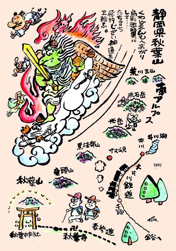 | ▼32-03:秋葉山三尺坊 【本文】 秋葉山といえば、天狗の山、火伏せの神として全国的に知られて いる山です。南アルプス赤石山脈の最南端にあり、「天竜奥三河国 定公園」の一角をなしているという。なるほど地図をみると、南ア ルプス最南端の光岳(てかりだけ・2591m)、黒法師岳(2067m)、 蕎麦粒山(1627m)のさらに南西方向に秋葉山(885m)があり、 れっきとした南アルプスの前衛なのであります。 頂上からの展望は素晴らしく、三河地方の山々・天竜川・浜名湖 ・太平洋まで望め、東海一とまでいわれています。いまは山頂南側 近くには、秋葉山本宮としての秋葉神社上社があり、火之迦具土大 神(ひのかぐつちのおおかみ)をまつっています。社務所わきには、 それこそデンと、キンキラキンの大鳥居が突っ立ち威圧しています。 そこから800mほど下った杉平(すぎだいら)というところに、 曹洞宗の秋葉山秋葉寺(しゅうようじ)があります。秋葉神社から、 杉の枝をかいくぐるように秋葉寺へ下る細い道はなんと薄暗いこと か。そしていまにも倒れそうな古いお寺(当時)。こんなありさま ですが、もとは神仏混淆で、明治の神仏分離令が出るまでは、秋葉 寺が秋葉神社を取り仕切っていました。毎年12月15、16日には、 有名な「秋葉の火祭り」が行われ、火防天狗秋葉三尺坊大権現に七 十五膳をお供えする儀式が執行されていたという。 この三尺坊という天狗は、江戸時代中期のはじめごろできたとさ れる日本の天狗48狗をあげた『天狗経』にも出てくる天狗です。 それには「南無大天狗小天狗十二天狗有摩那(うまな)天狗数万騎 天狗先ず大天狗には、愛宕山太郎坊、比良山次郎坊とつづき、秋葉 山三尺坊、高尾内供奉、……御嶽山六尺坊、浅間岳金平坊。総じて 十二万五千五百、所々の天狗来臨影向(ようごう)、悪魔退散所願 成就悉地(しっじ・成就)円満随念擁護、怨敵降伏一切成就の加持、 をんあろまや、てんぐすまんきそわか、をんひらひらけん、ひらけ んのうそわか」とあり、秋葉山三尺坊は36番目に出てきます。こ の天狗は鼻の高くない荼吉尼天で、白狐に乗った姿です。つまり長 野県飯縄山の飯縄系の天狗です。 そもそも天狗のお寺秋葉寺の山号は大登山。本尊は聖(しょう) 観音。秋葉権現の祭神が大己貴命(おおなむちのみこと)で、その 守護神が三尺坊権現だという。その三尺坊権現が近世中期以降に秋 葉信仰の主役になっていきます。いま山頂南側付近にある秋葉神社 はその後身だという。山腹の杉平(すぎだいら)にある秋葉寺は、 明治14年(1881)に再興されたもの。 ここに享保2年(1717)成立の「秋葉山略縁起」(山岳宗教史研 究叢書17)という文書があります。それには「それ諸仏菩薩の度 生化益の善巧方便ハ、きわまりなし。爰に東海道遠江国周知□(欠 落:郡・ごおり)犬居村大登山秋葉寺のゑんき尋(ね)る□(欠落 :に、)人王四十四主元正天王(※奈良時代・元正天皇第44代・在 位:715年・霊亀元〜 724年・養老8)の御宇(※ぎょう)養老二 (戌午)□□(欠落:歳に)(※養老2年・718)行基大師諸国遊化 (※ゆけ・遊行教化)の時此山に登りた□□(まい)山頂の杉の木 をもって聖観音、十一□□□(面観音)、勝軍地蔵、三菩薩の尊像 をきさ□□□(み給ひ)山頂永く衆生(しゅじょう)現世安穏、後 生善所□□□(の仏院)たらしめんとおぼしめして、安□□□□□ (民豊饒の為)此山草創し開基となり□□□□□□(たまふ。衆生) …」とあります。 欠落の所があって分かりづらいですが、「秋葉山略縁起」をはじ めとする参考書などを総合すると以下のようになるようです。秋葉 山は、奈良時代前半の養老2年(718)に、行基菩薩によって開か れ、山頂に行基が彫った聖観音と、十一面観音、勝軍地蔵を安置し たという。のちに、信州(長野県穂高村・いまの下高井郡木島平村 大字穂高)の生まれで、戸隠の西の窟(いわや)に籠もり修行した 修験者がいたといいます。 彼はさらに越後に行き、守門岳のふもと栃尾の楡原(にればら) 熊野神社蔵王堂(いまの楡原の岩野蔵王堂)の修験道場の「三尺坊」 で荒行をしました。修験者はここで、不動三昧の法を修行した結果、 神通力を得て両肩に羽が生え、生きながらに天狗三尺坊になったと いうのです。天狗になる前の彼の法名は不明だという。そして天狗 は、白狐に乗った荼吉尼天(だきにてん)の姿になり秋葉山に飛来、 行基が開いたこの山を安住の峰と定めました。さらに天からの声に 従い、この天狗は諸国をめぐったのちふたたび秋葉山に帰り、山の 守護神三尺坊権現という神になったとしています。永仁2年(1294 ・鎌倉時代)のことでした。 当時山の上に水がなく、不便この上ありません。住職が観音さま と守護神三尺坊に祈ったところ、山頂北西の隅に清水がわき出しは じめました(いまの機織井)。水の中を見ると、雲竜顴(けん・ほ おぼね)下の玉がふたつと、清水わきにガマが一匹うずくまってい ました。ガマの背中には「秋葉」の文字が浮かんでいました。秋葉 山の名はそこから起こった