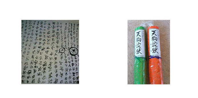 | ▼天狗の遺物 【略文】 各地の山や神社、仏閣には、「天狗」の像や文字が目につきます。 天狗のどくろは、茨城県加波山神社にありますし、鹿児島県霧島山 ろくには、「天狗兵法虎の巻」があるそうです。また、静岡県伊東 の仏現寺というお寺には「天狗の詫び状文」があるといいます。天 狗の爪も琵琶湖竹生島(ちくぶしま)宝厳寺(ほうごんじ)に陳列 されているそうです。 |