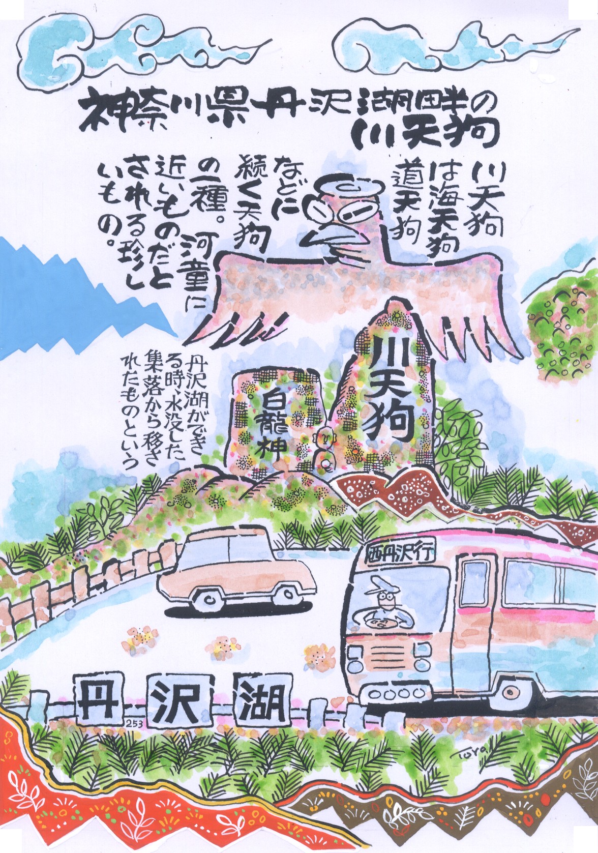 | ▼河童に近い川天狗(丹沢湖畔) 【本文】 高山に切っても切れないものに天狗がいます。天狗は妖怪・怪 人・魔物・鬼ににも例えられ、神通力・飛翔術もそなわっている といわれています。その天狗にもいろいろ種類・階級があるとい うから愉快です。 神奈川県山北町の三保ダム(昭和53年に完成)の工事で丹沢湖 ができる時、湖の底に水没する各集落から山の神や馬頭観音、庚 申などいろいろな石仏が湖周辺に移転、祭られたという。神縄ト ンネルバス停から玄倉へ向かう途中の沢沿いにある川天狗の石碑 もそのひとつ。 川天狗に向かって左手に白竜神の碑がならび、その間に小さな お地蔵さんが建っています。川天狗とは、天狗の一種で、河童に 近いものだともいわれています。そういえば口がくちばしの形で、 河童の口に似ています。 河童はその昔、唐天竺の黄河に大部族をなしていたといい、そ の一部族が海を渡り九州に渡ってきたという。族長は九千坊とい う名前だったというから、なんだか天狗の名にも似ています。 川に関係ある水天狗が、山形県出羽三山にひとつ羽黒山に水天 狗円光坊がいます。円光坊は、羽黒山に登るために船で最上川を 行き来する人たちの安全を守る天狗だといわれています。 かつては近畿地方、陸前や、陸中地方など日本海側から羽黒山 を目指す、信奉たちを運んだ舟便だといいます。水天狗円光坊の 神影は、鼻がとがり髪を伸ばし後ろでしばった総髪姿です。 左手で宝剣の柄をにぎり、右手で頭の上までのびる金剛杖を持 ち、白無垢の行者の姿で輪袈裟を掛けています。水天狗は全国唯 一の水の天狗であり水難守護の河童神ではないかともされていま す。 一方、昔から丹沢近郊にも「川天狗」のうわさがあったようで す。神奈川県津久井郡(相模原市緑区)では、夜、川に漁へ行く と暗闇の中で、大きな火の玉が転がることがるという。これは川 天狗の仕業で、その時は川原の石を洗い清めて、そこにとれた魚 を供えると、火の玉は出なくなるという。 そのほか投げ網を打っていると、近くで同じように投げ網を打 つのが見える。しかし姿はあらわさないという。また盛んな松明 の火と、大勢の人声が聞こえても、よく見ると何でもなく、こん ども姿をあらわさないこともあるという。このように、このあた りでは川天狗は姿をあらわさないらしい。ただ東京の川天狗は、 人前に姿をあらわしていたという報告もあります。 こちらは東京都奥多摩町のお話しです。旧小河内村の多摩川に 大畑淵という大きな淵がありました。そこに川天狗がすんでいた という。川天狗は、別に危害を与えるわけでもないのですが、い つも淋しそうでションボリと岩の上に腰かけ、物思いにふけって いる姿を見かけたという。 ところが、ある時から天狗の姿が見えなくなりました。村人が 「天狗さまはどうしたべ」と心配しだします。冬が過ぎ、春、夏 が去り、秋になったある日、キチンとした身なりで岩の上に天狗 を見かけました。 そばに美しい女性が寄り添っています。「天狗さまが嫁をもらっ た」と、村中の評判です。そんなある夜、天狗さまの嫁さんが、 膳と椀を借りに村人の家にきました。心よく貸してやると、次ぎ の朝、いつの間にか膳と椀が返されていて、なかにはミミズが入 っていました。 そばに「病気になったらこれを飲んでください」と書かれた手 紙がそえてありました。ある時、この家に病人が出て、熱病で明 日をも知れぬ状態になりました。家人が思いだして、ミミズを飲 ませたところ不思議に熱が下がったという。昔の民間療法で、熱 病にミミズが効くというのはこの時からはじまったということで す。 ある秋の一日、山と渓谷社から丹沢のイラスト本を出版させて 戴くにあたり、お山口の取材に登山口の取材で丹沢湖畔を歩きま した。その途中にある川天狗、話には聞いていましたが実物を見 るのははじめてです。興奮して横を見たり裏へ回ったりと調べま した。といっても文字だけの石碑ですが。ふと見ると同行者の皆 さんは、こんなただの石碑どこが面白い?というようにブラブラ しながらつまらなそうな顔をしていました。スミマセン。 ▼丹沢湖畔水天狗【データ】 【所在地】 ・神奈川県足柄上郡山北町。小田急新松田駅から西丹沢、中川温泉 行きバス玄倉下車10分で川天狗石碑。 【位置】 ・水天狗:北緯35度24分46.28秒、東経139度03分48秒 【地図】 ・旧2万5千分の1地形図:「山北(東京)」or「中川(東京)」(2図 葉名と重なる) ▼【参考】 ・『角川日本地名大辞典14・神奈川県』伊倉退蔵ほか編(角川書店) 1984年(昭和59) ・『図聚天狗列伝・東日本』知切光歳著(三樹書房)1977年(昭和52) ・『天狗の研究』知切光歳(大陸書房)1975年(昭和50) |