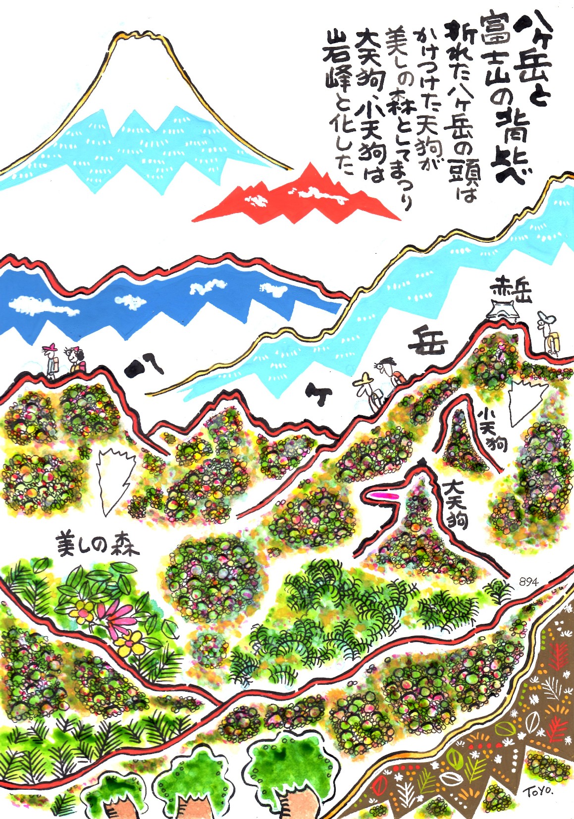 | ▼09:八ヶ岳赤岳・大天狗小天狗 【本文】 八ヶ岳は、標高2000m以上の山々が、南端の編笠山から北端の蓼 科山まで25キロにおよぶ連山(『山梨県の地名』)。かつては、八ヶ 岳といえば権現岳を中心とした地域で、「八ヶ岳大神」、「赤岳大神」 と刻まれた別々の石塔があるように信仰的側面ではいまの赤岳とは 独立した関係だったといいます。 八ヶ岳の中心が赤岳へ移っていくのは明治末期ごろとされている そうです。ご存じ赤岳は山肌が赤褐色をしているのがその名の由来。 その南、天狗尾根には大天狗、小天狗という奇岩峰もならんでいま す。 さて山梨県の甲府盆地からながめた時、南東にそびえる富士山、 それとは反対側の北西にある八ヶ岳。北西は死霊のおもむく地とも されています。山の形も優れず、人々は昔からどうしても富士山に 対して八ヶ岳には、陰・負のイメージを持っていたようです。 江戸後期の文献『甲斐叢記(かいそうき)』でも、富士山を美し い「花開耶姫(このはなさくやひめ)」にたとえ、一方八ヶ岳は醜 い「磐長姫(いわながひめ)」にたとえています。八ヶ岳にも修験 がいたにもかかわらず、地方霊山の尊称も得られず、南麓一帯の信 仰圏にとどまっていたのはこんなことに原因があるのかも知れませ ん。 山の背比べ伝説もその一つです。富士山と八ヶ岳が高さ競べをし た時、八ヶ岳から富士山へ樋(とい)をかけ、水を流したら富士山 の方へ流れました。負けた富士山はおこって八ヶ岳の頭を樋で打っ たうえ、横腹を蹴り上げました。そのため八ヶ岳の峰はいくつにも 分かれてしまったという話が平安末期の(『伊呂波字類抄・いろは じるいしょう』)にあります。 これは結構知られた伝説ですが、こんな話も残っています。大昔、 あちこちの地面に音もなくしわが寄りはじめました。そしてしわは 見るみる盛り上がり、煙と火と泥が吹き出してどんどんと高くなっ ていき、山が生まれました。こうして生まれた山々の中で、目立っ て高いのが富士山と八ヶ岳でした。 そのうち、どちらともなく背の高さを自慢し競争をはじめました。 先に生まれた八ヶ岳はさすがにどんどん高くなっていきました。富 士山も負けずに伸びています。八ヶ岳はこの辺で差をつけてやれと ばかり、「グイ」と背伸びをしました。 そのとたん、頭の方が3分の1ばかりポッキリと折れてしまいま した。折れた八ヶ岳の頭からは新しくいくつもの頭が出てきました が、高くはなりませんでした。八ヶ岳はくやしくて毎日泣いていま した。8つの頭の両方の目、計16もの目から涙を滝のようにあふれ 出ています。 この騒ぎを聞いて京都の鞍馬山から大天狗が飛んできました。事 情を聞いた天狗は八ヶ岳に同情しました。そして小天狗に申しつけ て赤岳の頂上に社を建てたそうです。 折れた八ヶ岳の頭は南東の山腹に丁重に鎮座させ、斎(いつき) 祭らしめたといいます。この森を斎(いつく)しの森と呼びました。 この森は、のちに美しの森というようになったそうです。 一方、大天狗・小天狗たちは同情のあまり岩になり、赤岳の南で 大天狗・小天狗という2つの岩になっていまも見守っています(『日 本伝説大系5・南関東』)。 そうか、八ヶ岳の天狗は京都鞍馬山系の天狗だったんだ。また富 士山からみて、甲斐駒ヶ岳と八ヶ岳とどちらが高いかを争ったとこ ろ、甲斐駒の方が高かったため、甲斐駒の神が八ヶ岳をたたいたら 8つに分かれてしまったという伝説もあります。 当時の神はねたんだり悔しがったりふてくされたり、人間くさく て愉快です。それにしても民衆は、まわりの風景で壮大な想像をす るものですね。 ▼八ヶ岳【データ】 【所在地】 ・長野県の諏訪地域と佐久地域と山梨県との境。 【地図】 ・2万5千分の1地形図「八ヶ岳西部(甲府9)」 【参考文献】 ・『伊呂波字類抄』(『色葉字類抄』いろはじるいしょう)(編者・橘 忠兼)平安末期・院政期成立の国語辞書 ・『甲斐叢記(かいそうき)』(一名『甲斐名所図会』)》嘉永1年(1 848・江戸後期) ・『角川日本地名大辞典19・山梨県』磯貝正義ほか編(角川書店)1 984年(昭和59) ・『角川日本地名大辞典20・長野県』市川健夫ほか編(角川書店)1 990年(平成2) ・『信州の伝説』(日本の伝説3)浅川欽一ほか(角川書店)1976年 (昭和51) ・『日本山名事典』徳久球雄ほか(三省堂)2004年(平成16) ・『日本伝説大系5・南関東』(千葉・埼玉・東京・神奈川・山梨) 宮田登ほか(みずうみ書房)1986年(昭和61) ・『日本歴史地名大系20・長野県の地名』(平凡社)1979年(昭和54) ・『山の伝説』日本アルプス編(青木純二)(丁未出版)1930年(昭 和5) |