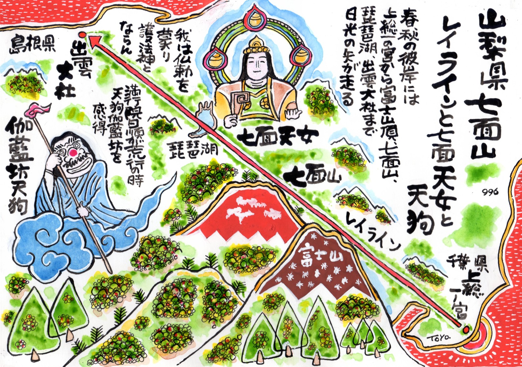 | ▼01:七面山伽藍坊天狗と天女 【本文】 七面山は日蓮宗の山岳信仰の聖地として有名な山。日蓮宗の総本 山・身延山の奥の院とも呼ばれています。この山ははじめ、真言宗 の七面山修験によって開かれたといいます。のちに日蓮の弟子であ る日朗によって日蓮宗に改められ、いまのような大伽藍(寺院など の建物)が建立されるまでに発展したもの。 山名の由来は、主神の七面天女から「鬼門の一方を閉じて七面を 開く」という意だそうです。別名をナナイタガレともいい、山全体 に崩壊が見られます。とくに山頂の東斜面にはオオガレと呼ばれる 大崩壊があり、いまも崩壊が続いています。 ちなみにナナイタガレの意味は、「ガレ」が斜面の崩壊部指す地 形語で、「ナナ・イタ」も同じく斜面や崖を意味するといわれます。 ナナイタナガレの大崩壊地の縁を通って三角点のある広い山頂につ きますが、ウラジロモミなどの若木に囲まれて展望はイマイチです。 北斜面には七面山ゴヨウツツジが群生し、山頂近くは県の自然保 存地区に指定されています。山頂付近には、敬慎院(身延山久遠寺 管轄のお堂)があり、この辺一帯は隣の山梨県身延町の飛び地にな っているとか。 参道が登山道になっていて、あいさつは「こんにちは」ではなく 「ご苦労さま」。ゴミがひとつ落ちていなく、なんとなく神聖な気 持ちです。身延山久遠寺に参拝した人たちは、七面山敬慎院におこ もりして境内にある七面社本殿近くの富士山のご見晴台でご来光を 拝んで下山します。 身延山はかつて日蓮が弟子たちとともに修行生活を送った地で す。また、日蓮が弘安5年(1274)に没する際、「いずくに死候と も、はかをばみのぶのさわにせさせ候べく候」という遺言。それに 従って遺骨を埋葬した場所でもあります。 この山には伝説も多い。佐渡に流刑された日蓮聖人が、1274年 (文久11)、前年幕府から宥免された日朗とともに、身延の地に庵 を結び、説法をして歩いていました。身延の谷間の奧に大きな岩が そびえ立っています。日蓮は、いつもこの岩に腰を掛け、弟子や檀 家に説法していました。そのため、のちにこの岩を法話石と呼んで います。 ある時、この説法の座に20歳くらいの美女がやってきて、日蓮 に寄り添うようにしていろいろと世話をしています。それを見て人 々は不審がりました。それを見た日蓮は、女性に向かって「本形に 復せんや」(正体を見せてあげなさい)といって華瓶の水を与えた ました。すると美女はたちまちに3mあまりもある毒蛇の姿をあら わしました。 やがてこの毒蛇は、「仏勅を蒙り護法神とならん、永く、此山を して水火兵革之難有之事無く、其衆生一乗を信受して無上菩提に回 向する事有之者は、其所願皆如意吉祥を得せしめん」。 つまり、(自分は仏勅を蒙って護法の神になるもの)「身延山に水 火兵革の難がないようにし、一乗の法華経を信受する者には、その 願うことを意のごとく叶えること」を誓うと、風になって七面山へ 去っていったというのです。 これが本地(本当の姿)が吉祥天女だとする七面天女なのだそう です。七面大明神ともいわれる法華経と日蓮宗の守護神です。以来、 七面山は法華経の聖地となったといわれています。 この七面天女が七面山の山名の由来とかで、江戸時代の甲斐の地 誌『甲斐国志』(巻之五十一)に、「所(レ)謂七面山ハナヽイタガ レノ山トモミユ <(※2行書き)痛ク虧(かけ)タル処有(二) 七所(一)トイフ名ナルベシ> 七面明神(七面天女とも)ヲ祀リ 遂ニ山名トナル…」と記載されています。 また『日蓮上人御伝記』という書物には、「七面山は身延のたけ の西、はるき川の上にあり、吉祥天のあとをたれ、大明神とあらは れ給ひし所也。此の山鬼門をふさぎて七面をひらく、ゆゑに名付け たり。金輪際よりわき出でて黄金の地なりといいつたふ。いただき に池あり、八功徳水をすまし、五色の雲つねにたなびけり、其のけ はしき事鳥もかけりがたく、鹿もわたりがたし」と記されています。 また敬慎院(七面山本社)の随身門前は、春秋の彼岸に富士山か ら富士山頂からのご来光を拝める場所として知られています。ご来 光は随身門から本堂に安置されている七面大明神にさし込むとい う。これは、随身門と本殿と富士山頂が、日の出の位置と直線上に あるために見られる現象で、計算されて配置されているというので す。 さらには、富士山と七面山とを結ぶラインを東に延長すると、千 葉県の上総一ノ宮神社に行きつくという。また西にのばすと、琵琶 湖の上を通って島根県の出雲大社までを結ぶレイラインが浮かぶと いう。早い話が千葉県の上総一ノ宮から昇った太陽の光が、富士山 の上を通り七面山の山頂に届き、さらに琵琶湖の上から出雲へと届 くというのですから驚きます。 お話し変わって、この七面山にも天狗がいることになっています。 この天狗はある時、身延山積善流の祈祷師である満行院日順が、七 面山千日参籠の荒行を修した際、天