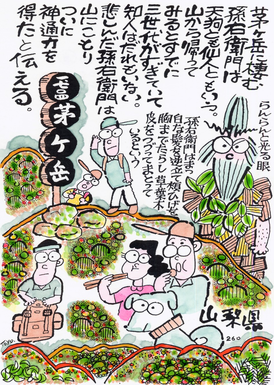 | ▼03「茅ヶ岳・孫右衛門天狗」 【本文】 山梨県の茅ヶ岳には怪人孫右衛門の伝説があります。怪人は天狗と も仙人ともいいます。前身は上野国(群馬県)の人だという。若い とき両親を亡くし、それ以来飲む打つ買うの放蕩三昧。 とうとう身を持ちくずし、親戚や村の者にも見放され、武田信玄の 父信虎の全盛時代(甲府に城を進出させたのが永正16年・1519年) のころ、茅ヶ岳西麓の山梨県北杜市須玉町(旧北巨摩郡須玉町)の 江草地区に移住してきたといいます。 ある時山中で仙人が碁を打つのをつい夢中で見ているうち、ふと気 がついて家に帰りましたが、すでに人間にして三代もの時が過ぎて いて誰も知る人がいなかったという(地元の地誌『須玉町誌』)。 それからというもの孫右衛門は人とうまくつき合えず、ついに世を 捨てて山ごもり天狗になったという。室町時代の永正年間(1504〜 20)のことだとそうです。それからは孫右衛門は、山中をすみかと し、食料のシカや猿、兎やキツネを追って山や谷をかけまわってい たといいます。 江戸時代初期のまでは山仕事をしている人の前に時々あらわれたい う。江戸時代初期の延宝のころ(1673〜81)までは山仕事をしてい る木こりなどの前に時々あらわれ、木の伐採の手伝いをしたり、分 けてもらった弁当を喜んで食べていたといいます。 またたばこをやると手のひらに乗せて食べてしまうともいわれま す。その後だんだん人と会うのがうとましくなり、時々山の中で見 かけることはあっても近づいては来なかったという。 すっかり人々のうわさから遠ざかった正徳年間(1711〜1716年)、 江草地区の村人が山仕事中、異様な怪物が大岩の上に立ってにらん でいます。逆立てた頭髪は真っ白で頬ひげは胸までとどき、大きな 目がらんらんと光り、草の葉、木の皮をつづって着物にしていたと いう。肝をつぶした村人は、命からがらわが家へ逃げ帰えりました。 するとたちまち、大風が吹きはじめ黒雲空を覆い、篠つく雨ととど ろく雷鳴に村人は生きた心地がしなかったという。うっかり孫右衛 門の昼寝のジャマをして怒らせてしまったらしいのです。 日本の仙人37人を解説した『本朝神仙記伝』(平安時代後期の漢学 者大江匡房(おおえのまさふさ)撰録)には、「是全く孫右衛門が、 熟眠の場なるを知らず、草を刈て驚かせし故に、斯る変を示したる ものならんと、人々語り伝えしとなん。今も時として姿を顕はすこ とあり。村人恐れて、孫右衛門天狗といふとぞ」とあります。 茅ヶ岳西南の尾根(いまの新左右衛門尾根)には孫右衛門天狗をま つる祠があると聞きますがまだ確認できていません。なお、江戸時 代、松平定能(まさ)編集した地誌『甲斐国志』では孫左右衛門に なっていますが『本朝神仙記伝』などでは孫右衛門の名で登場して います。 ▼茅ヶ岳【データ】 【所在地】 ・山梨県北杜市須玉町(旧北巨摩郡須玉町)と同県甲斐市旧敷島町 各地区名(旧中巨摩郡敷島町)との境。中央本線韮崎駅の北11キロ。 JR中央本線韮崎駅からバス・穂坂柳平から歩いて3時間30分で茅 ヶ岳。二等三角点(1703.6m)がある。地形図に山名と三角点の標 高の記載あり。 【名山】 ・深田久弥選定「日本百名山」(含まれず):日本二百名山、日本三 百名山にも含まれる。 ・深田クラブ選定「日本二百名山」(第148 番):日本百名山以外に 100山を加える・日本三百名山にも含まれる。 ・山梨県選定「山梨百名山」(第19 番) 【位置】 ・三角点:北緯35度47分42.21秒、東経138度30分49.5秒 【地図】 ・2万5千分の1地形図「茅ヶ岳(甲府)」 ▼【参考】 ・『甲斐国志』(松平定能(まさ)編集)1814(文化11年):(「大日 本地誌大系」(雄山閣)1973年(昭和48) ・『図聚天狗列伝・東日本編』知切光歳(三樹書房)1977年(昭和5 2) ・『仙人の研究』知切光歳(大陸書房)1989年(平成元) ・『日本歴史地名大系19・山梨県の地名』(平凡社)1995年(平成7) ・『本朝神仙伝』大江匡房(「日本古典全書・古本説話集」川口久雄 校注(朝日新聞社)1971年(昭和46) ・「山の人生」柳田国男:(『柳田国男全集4』(筑摩文庫)1989年(平 成元)所収) |