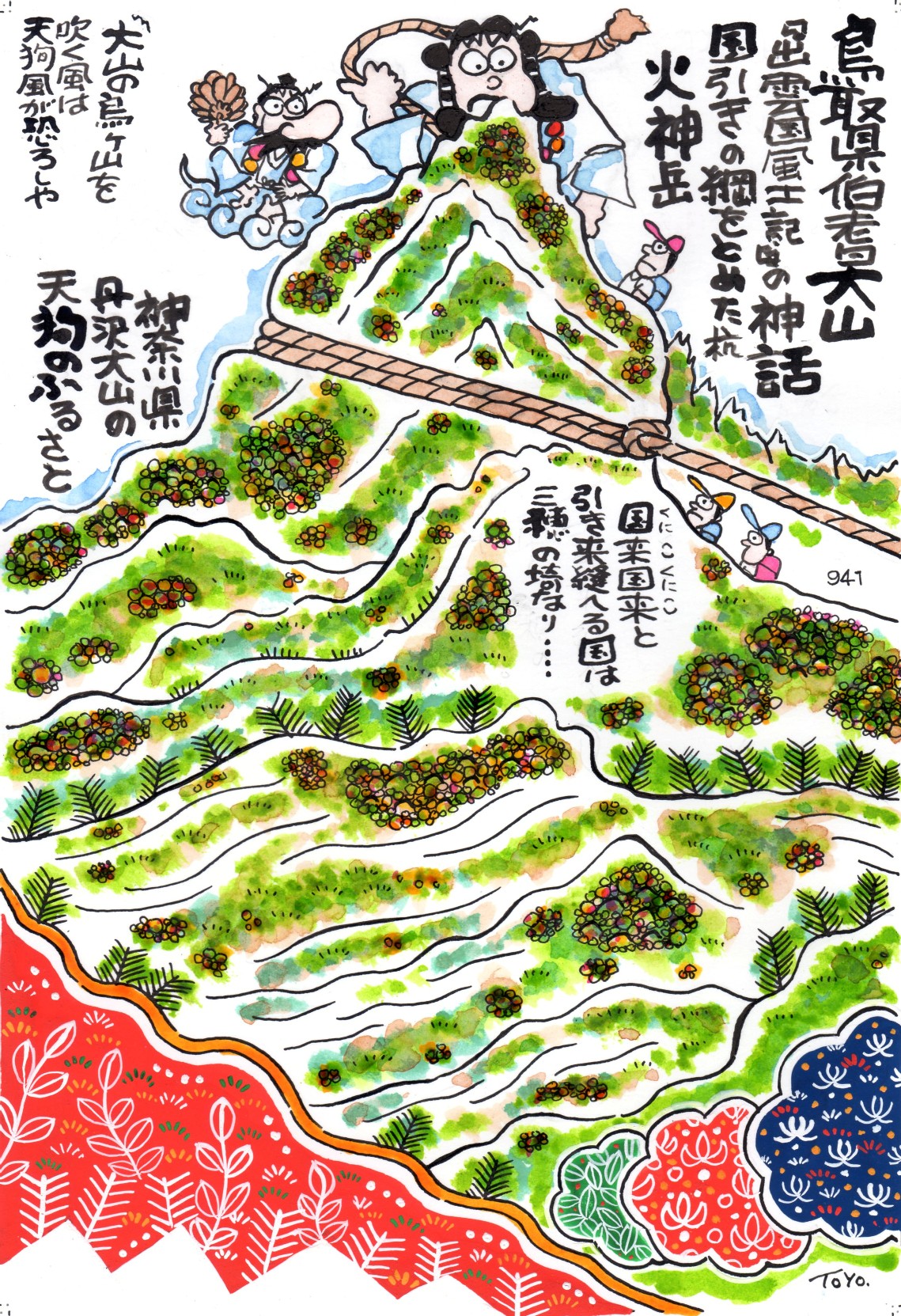 | ▼01:鳥取県・伯耆大山の清光坊天狗 ・【本文】 鳥取県の西部にそびえる大山(だいせん)は、旧国名から伯耆 大山(ほうきだいせん)と呼ばれています。また見る方向によっ ては富士山にも似ているため、伯耆富士と呼ばれます。さらに、とな りの出雲(島根県)からの方が眺めがよいので「出雲富士」ともいいます。 主峰は弥山(1710.6m・三角点がある)で、最高峰は剣ヶ峰(1 729m)。この山は古来から神います山とされ、霊山としてあがめられて きました。その起源についてこんな話が残っています。『大山寺縁起(だ いせんじえんぎ)』という文書の「第一巻二段」に、イザナギ、イザナミの神 の大昔、天からひとつの大盤石が落ちてきたという。 その時、大盤石が3つに割れて和歌山県の熊野山と、奈良県金峰(き んぷ)山、そしてここ大山(だいせん)の3つの山になりました。だから大 山(だいせん)は日本第3の霊山だというのです。 『大山寺縁起』は、鎌倉時代後期の正中2年(1325年)から元徳元年 (1330年)に間成立した作者不明の大山信仰に関する貴重な史料。(神 奈川県丹沢大山(おおやま)にも同じ題名の『大山寺縁起』があるので注 意)。また大山(だいせん)には、有名な「国引き伝説」も残っています。 奈良時代の『出雲国風土記』(意宇(おう)郡の条)に、八束水臣津野 命が国を作る際、「出雲の国は狭い若国(未完成の国)なので、他の国の 余った土地を引っ張ってきて広く継ぎ足そうとした」と記されており、西は 佐比売山(島根県・三瓶山)、東は火神岳(ひのかみだけ・鳥取県大山) に綱をかけて、東端の「三穂(みほ)の埼」は北陸から引き、西端の「支豆 支の御埼(きづきのみさき)」は朝鮮半島の新羅から引いてきたという。 その間の「闇見(くらみ)の国」と「狭田(さだ)の国」は、それぞれ「北門 (きたど)の良波(よなみ)国」、「北門の佐伎(さき)国」から引き寄せます。 神は「国来国来(くにこくにこ)」とかけ声をかけて国を引いてきました。そ してできた土地が現在の島根半島であるといわれています。 一方、この山の開山は、天武天皇の12年(684)、開祖は役行者であ るという。また行基(ぎょうき)が開山したとも記すものもあります(平安後期 に成立した『伊呂波字類抄』)。 またこんな伝説もあります。出雲国玉作(島根県八束郡玉湯町玉造) の猟師の依道(よりみち)が、たまたま美保の浦を通りかかった時に、海 底から金色の狼があらわれました。狼は依道を誘うようにして、大山(だ いせん)山中の洞に入りました。ここぞとばかり依道が矢をつがえると、地 蔵菩薩があらわれました。 驚いていると、狼が老尼にかわり「私は登欖尼(とらんに)という山ノ神 である。あなたに地蔵菩薩をまつってもらいたいと思い、ここまで導いた」 といったという。畏れおののいた依道は決心して金蓮と名のって出家した という。金連は修行にいそしみ、やがて釈迦如来をも感得し南光院という お寺を開いてこれをまつりました。さらに阿弥陀如来を感得してまつった のが西明院だという(『大山寺縁起』)。 さらに大山(だいせん)は天狗の山としても知られています。首都圏で 人気のある神奈川県丹沢大山(おおやま・相模大山)の阿夫利神社下 社わきにあるレリーフ(石碑)の天狗、伯耆坊はこの伯耆大山(だいせん) から山移りしてきたものだそうです。いまそのあとの大山(だいせん)にい るのは清光坊(せいこうぼう)という天狗だといいます。 大山(だいせん)では昔から「大山の烏ヶ山を吹く風は、天狗風か恐ろ しや」と伝える里謡がありますが、これは伯耆坊のことらしいという。丹沢 大山にいる伯耆坊天狗は日本を代表する「日本八天狗」にも入っている エライ天狗ですが、伯耆大山の清光坊天狗も山伏たちが唱える『天狗 経』の48狗に入る天狗です。 天狗関係ではこんな話もあります。『陰徳太平記』(4)という本に、出雲 の戦国大名の尼子晴久(あまごはるひさ)が、月山富田城(がっさんとだ じょう)の戦い(いまの島根県安来市)の時、安芸(現広島県)の毛利元就 (吉田郡山城)を討とうとして、兵を集めている晴久に(1540年(天文9) 室町時代後半)、この山の天狗が、大山(だいせん)の神大智明権現(だ いちみょうごんげん)の神託(お告げ)を伝えて思いとどまらせようとした記 述があります。 「伯耆大山(だいせん)神勅(しんちょく)(神のお告げ、命令)ノ事 或 時、富田の城へ、色白う丈(たけ)高く清げなる山伏一人来(た)り、伯耆 大山の使僧なりと案内を請ふ。晴久対面せられしに、彼の山伏、今度芸 州(安芸)御出張の思し召し、留まられ候かしと申しければ、晴久、それ は衆徒中よりの使いに候かと問い給ふ。 いや是(これ)は権現御神託にて候。御疑ひを晴し申すべき為なれ ば、証拠を示し候べしとて、懐中より鶏の蹴爪の如くなる物、長さ一尺余 りならんを出したり。晴久、是は不思議の御事、有り難き神勅かな。かか る神勅を受けながら、違背申さんは冥慮(めいりょ)の程恐れ入り候と雖 も、諸国の軍士、羽檄(うげき)(急を要する檄文?(げ